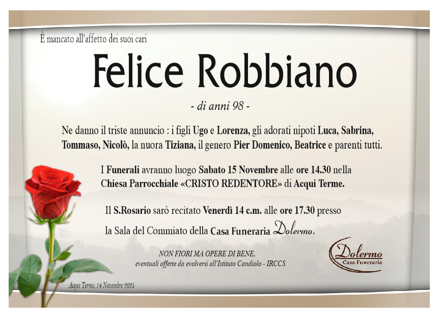 I familiari ringraziano anticipatamente tutti coloro che parteciperanno alla cerimonia funebre