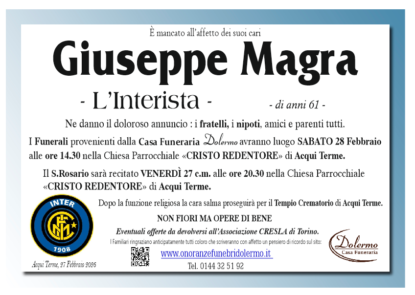 I familiari ringraziano anticipatamente tutti coloro che parteciperanno alla cerimonia funebre