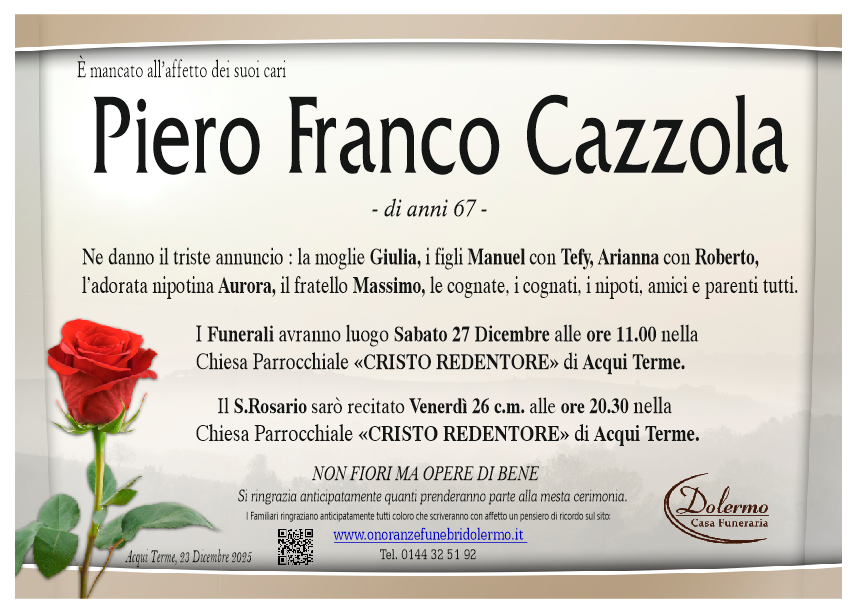 I familiari ringraziano anticipatamente tutti coloro che parteciperanno alla cerimonia funebre