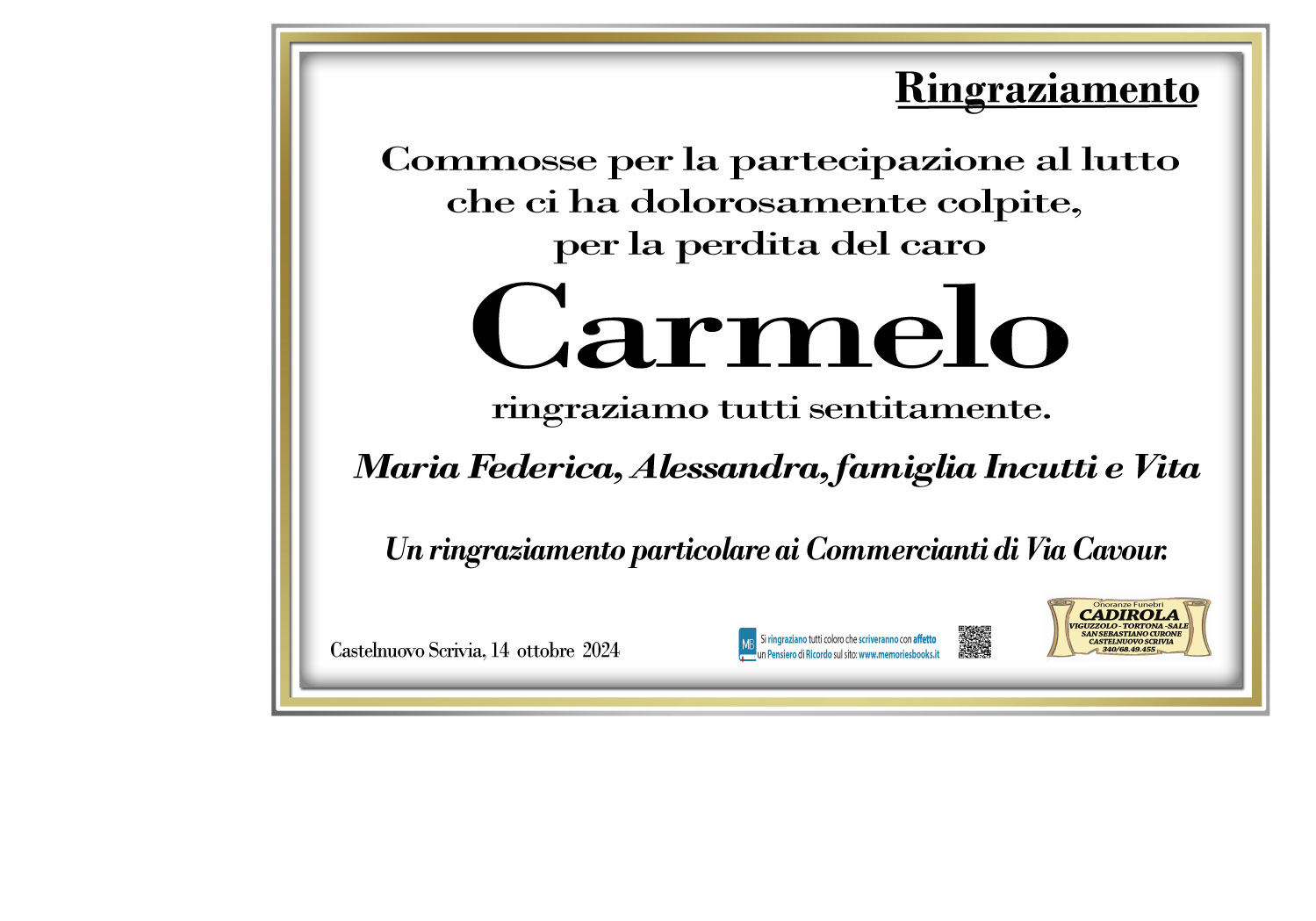 Carmelo è andato via in punta di piedi lasciando un vuoto incolmabile ! Lo ricorderemo sempre per il suo animo gentile e la sua generosità. Un abbraccio fortissimo a Federica ed Alessandra da tutti noi. Vi siamo vicini con tutto il cuore