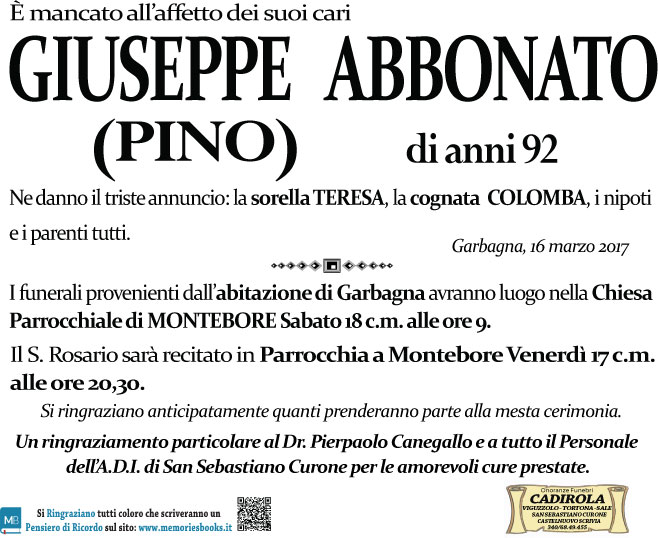 Clicca il pulsante qui sotto per visualizzare sulla mappa il luogo dove riposa GIUSEPPE ABBONATO.
