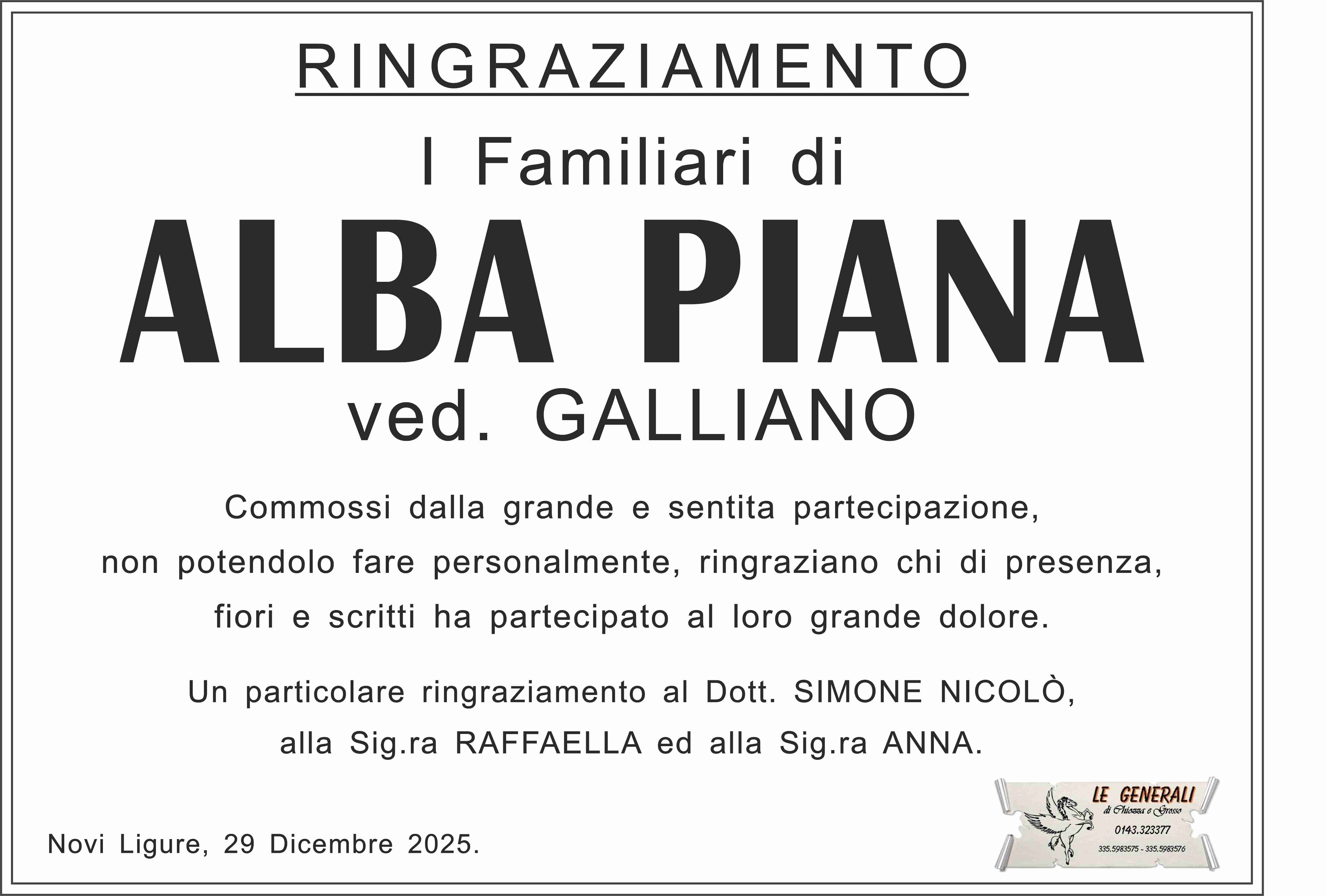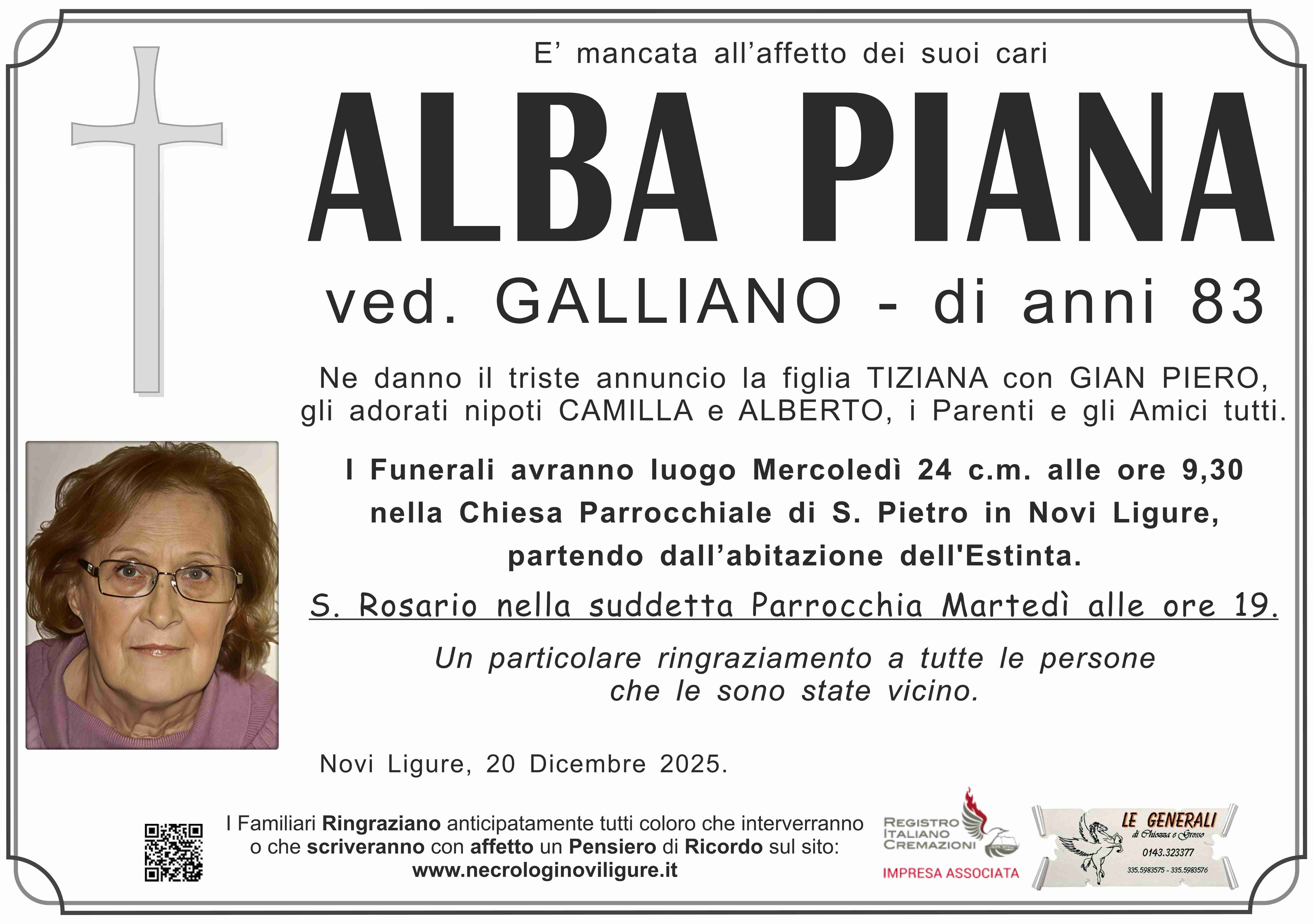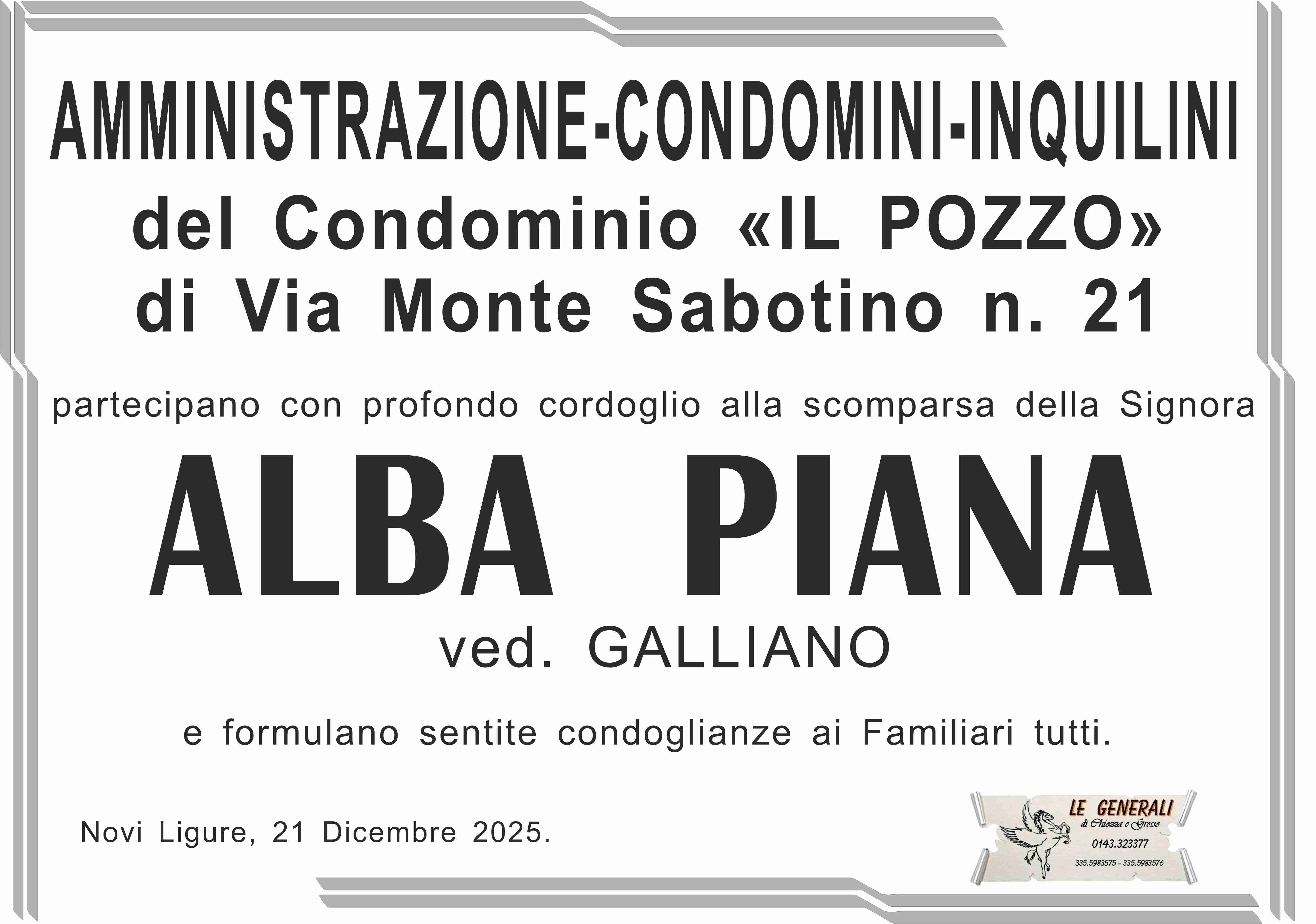 Ciao Alba, cara ex collega. Mi mancheranno le nostre chiaccherate anche se solo al telefono. Hai raggiunto Piero, ora riposa in pace. Ai tuoi famigliari le mie piu sentite condoglianze. Alba Poggio