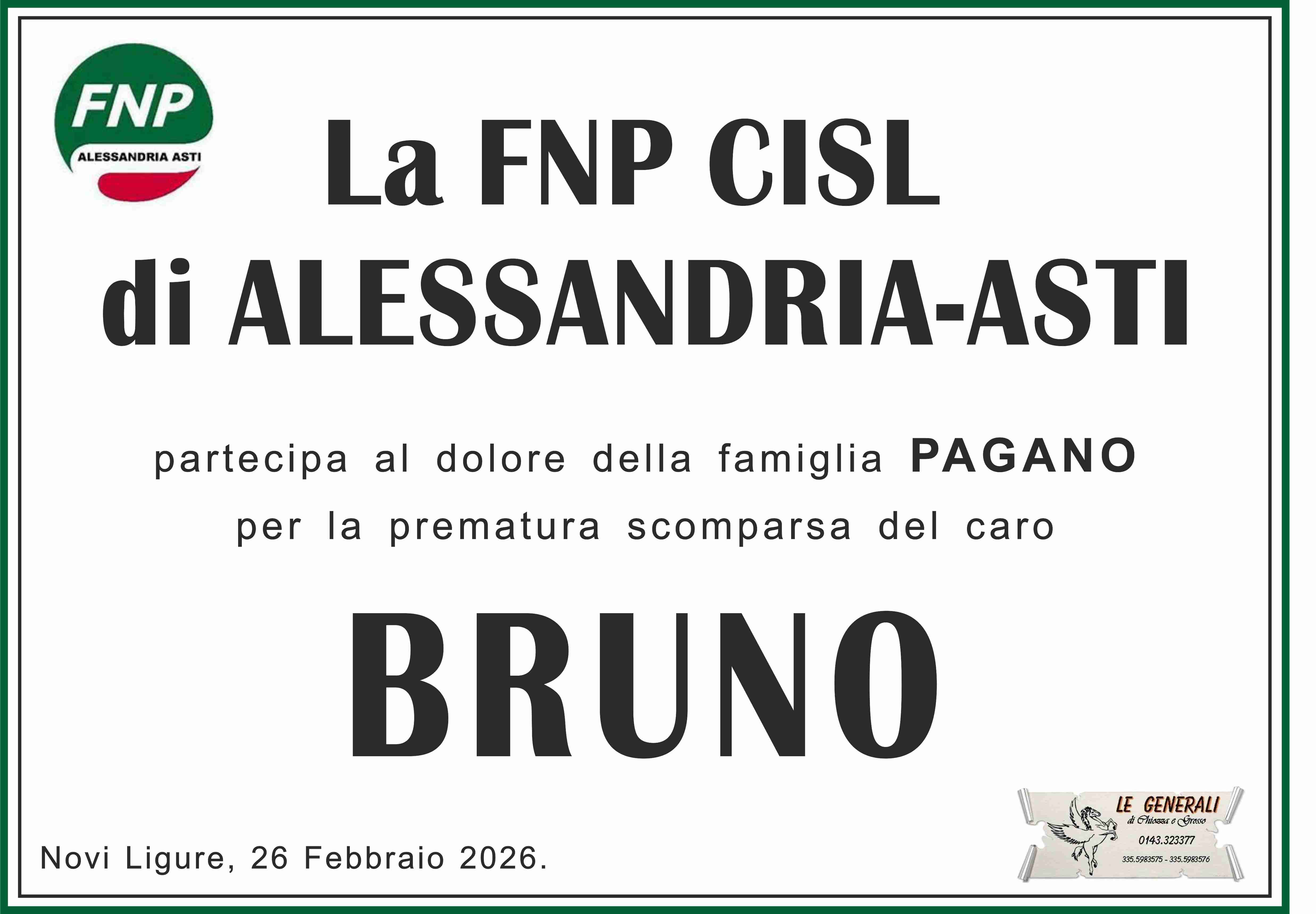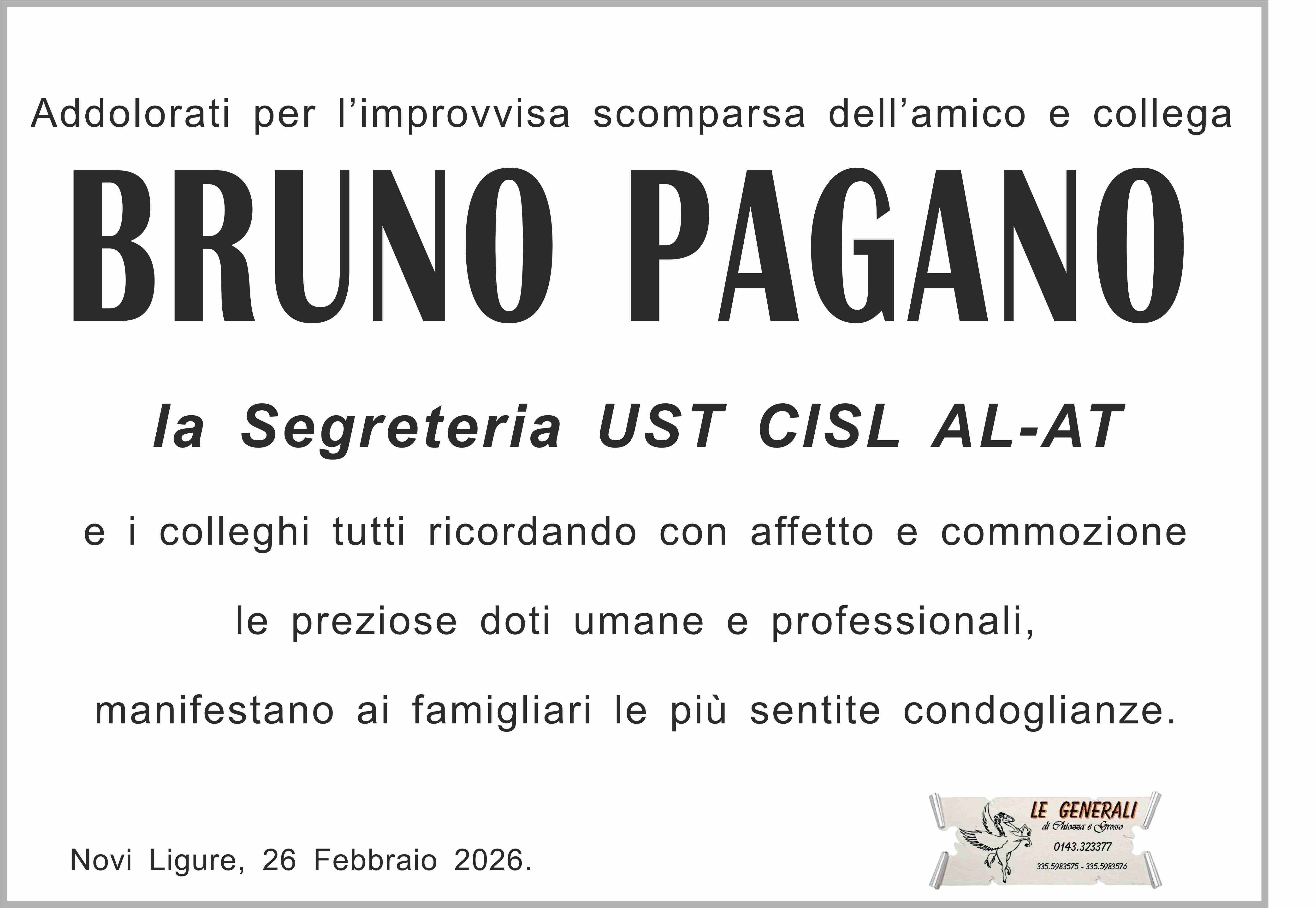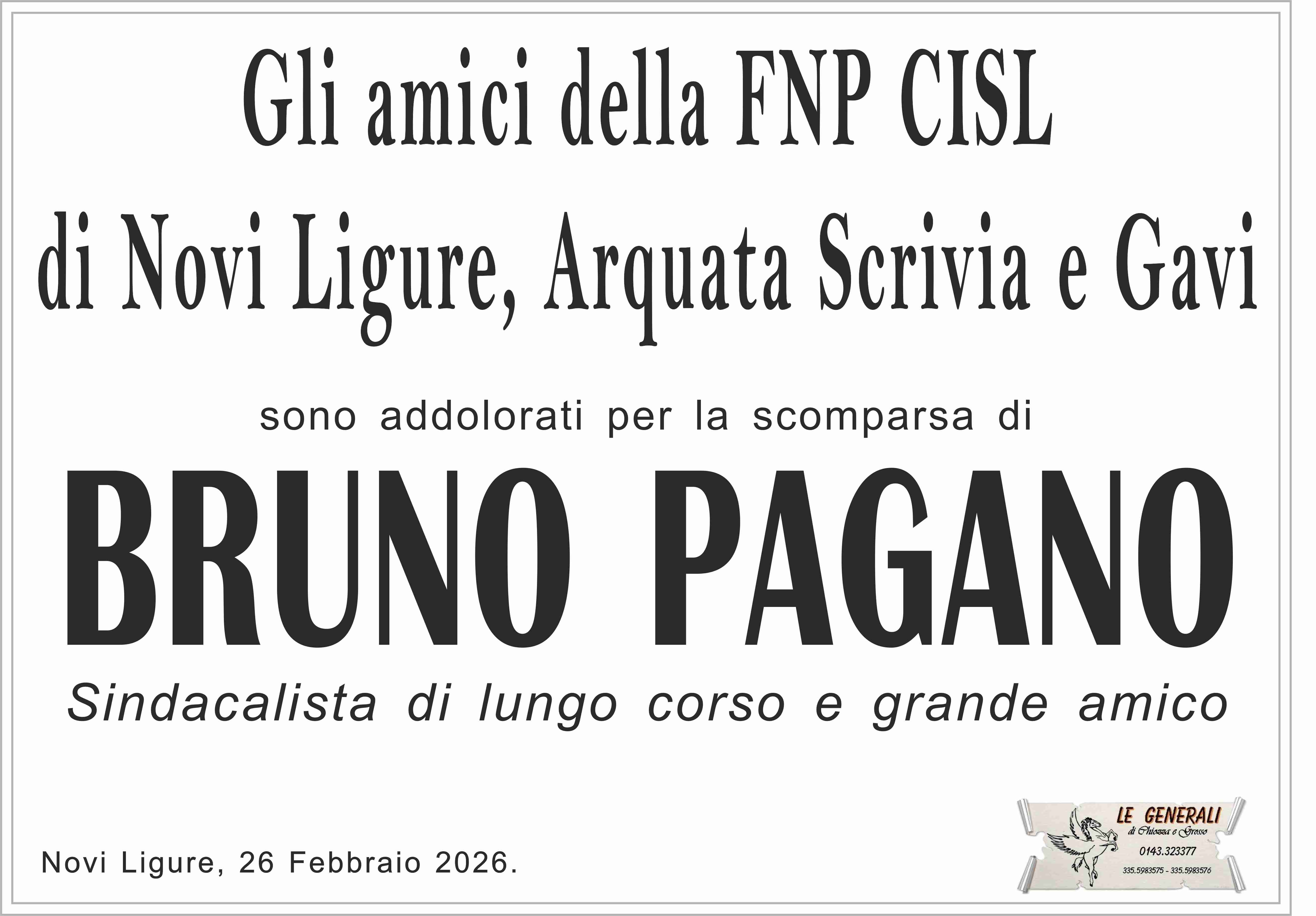 Colpito dall'improvviso lutto, porgo le più sentite condoglianze alla famiglia tutta dell'amico Bruno nel ricordo della fattiva collaborazione presso la Federazione Pensionati Novi Ligure
