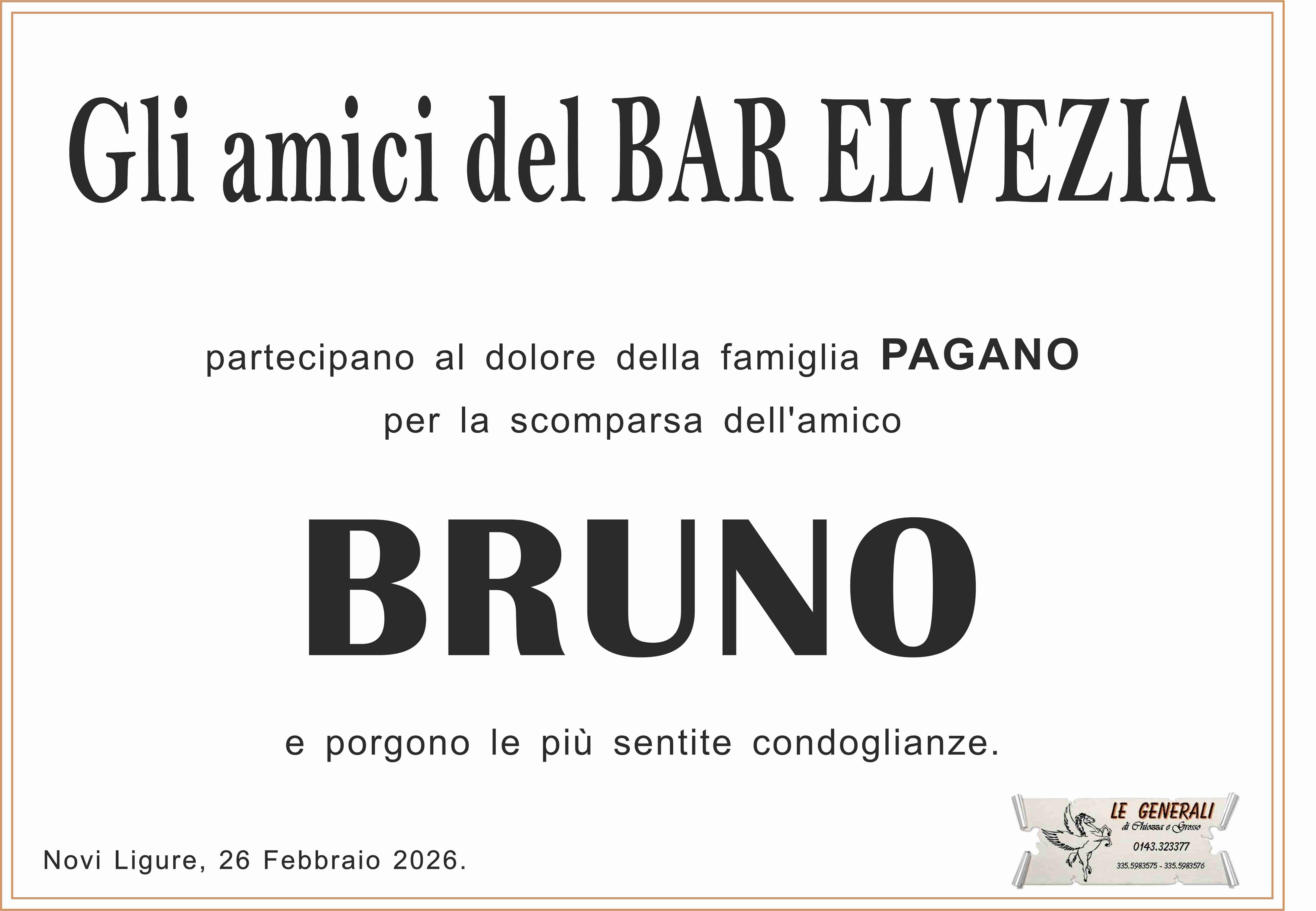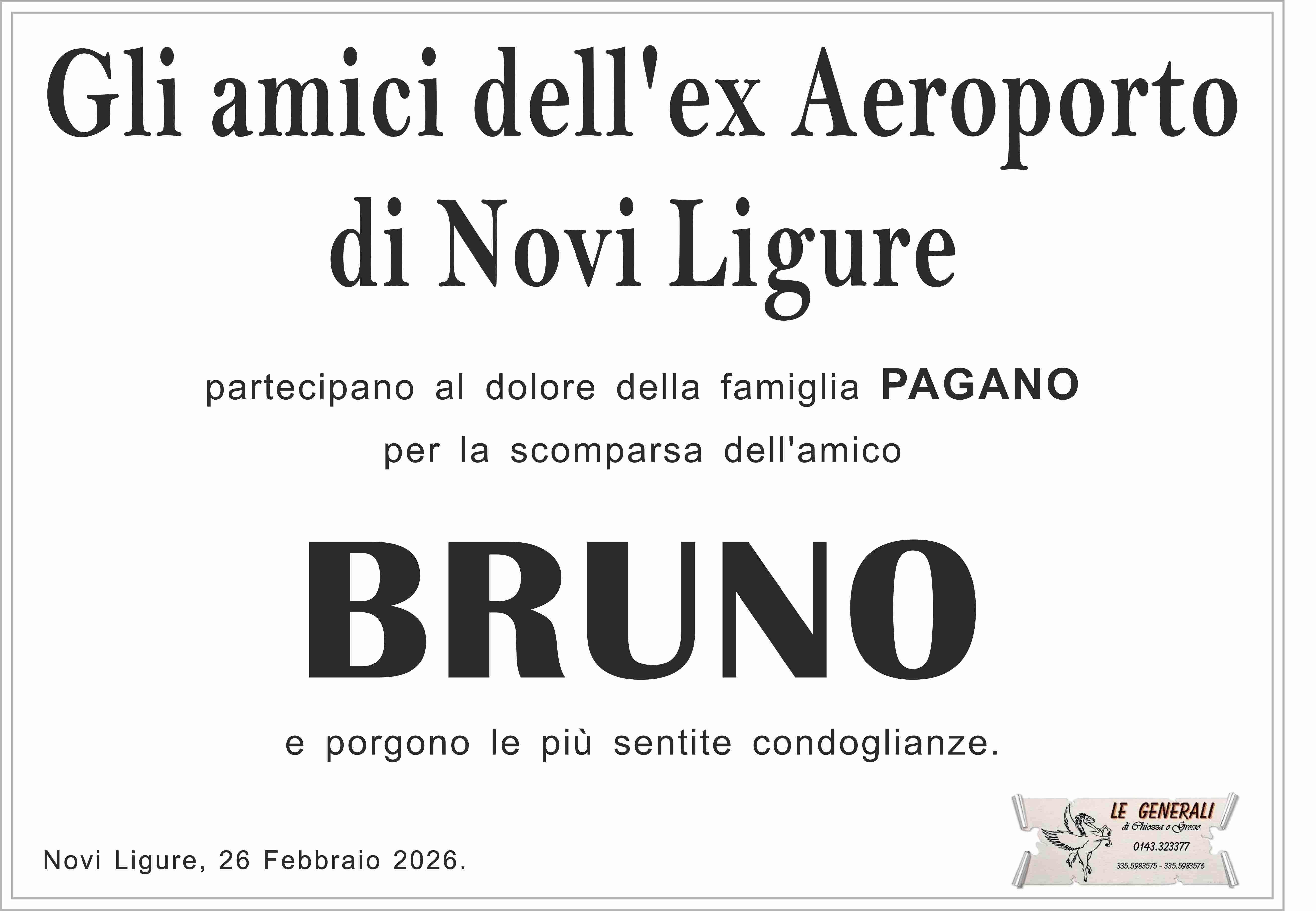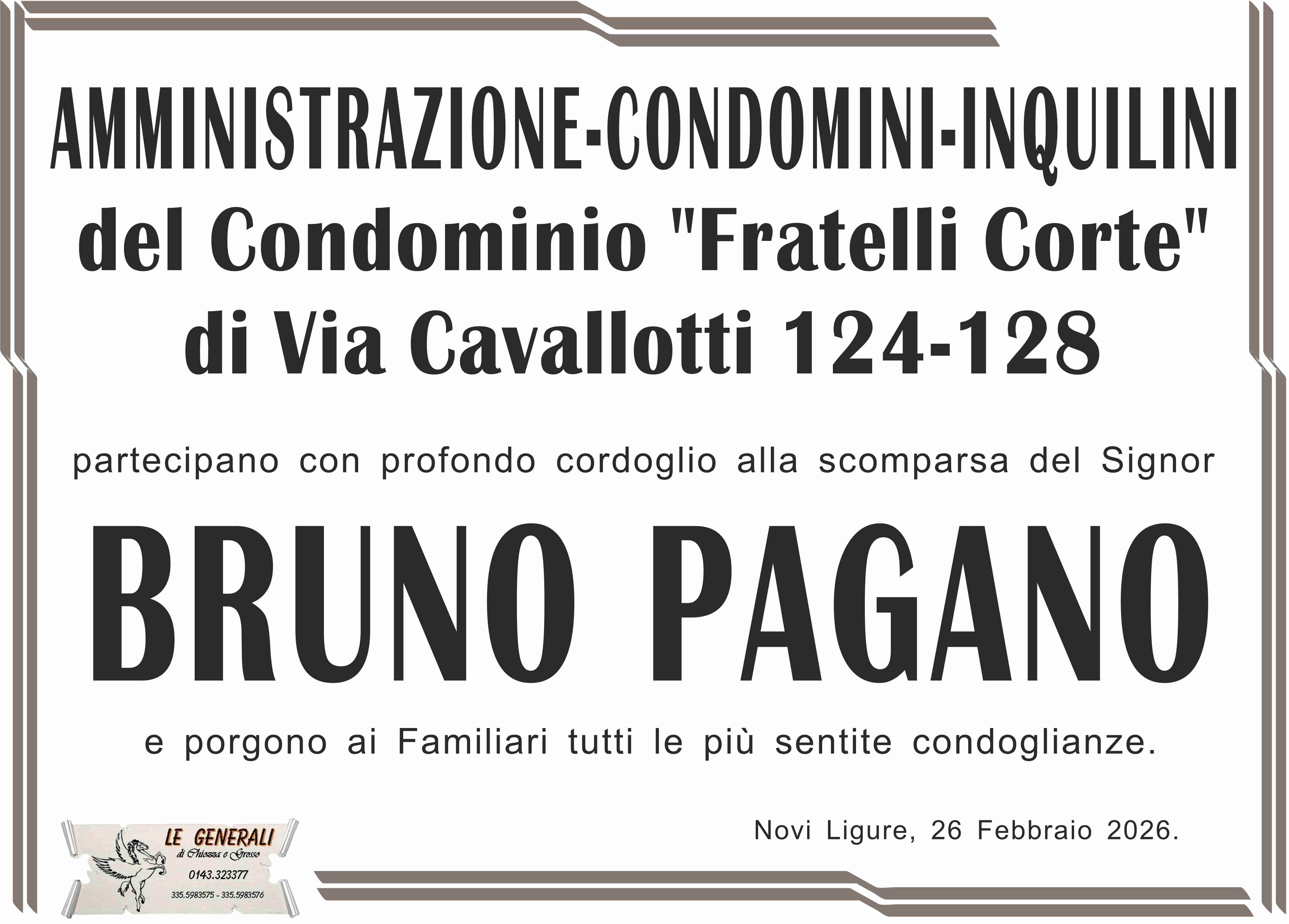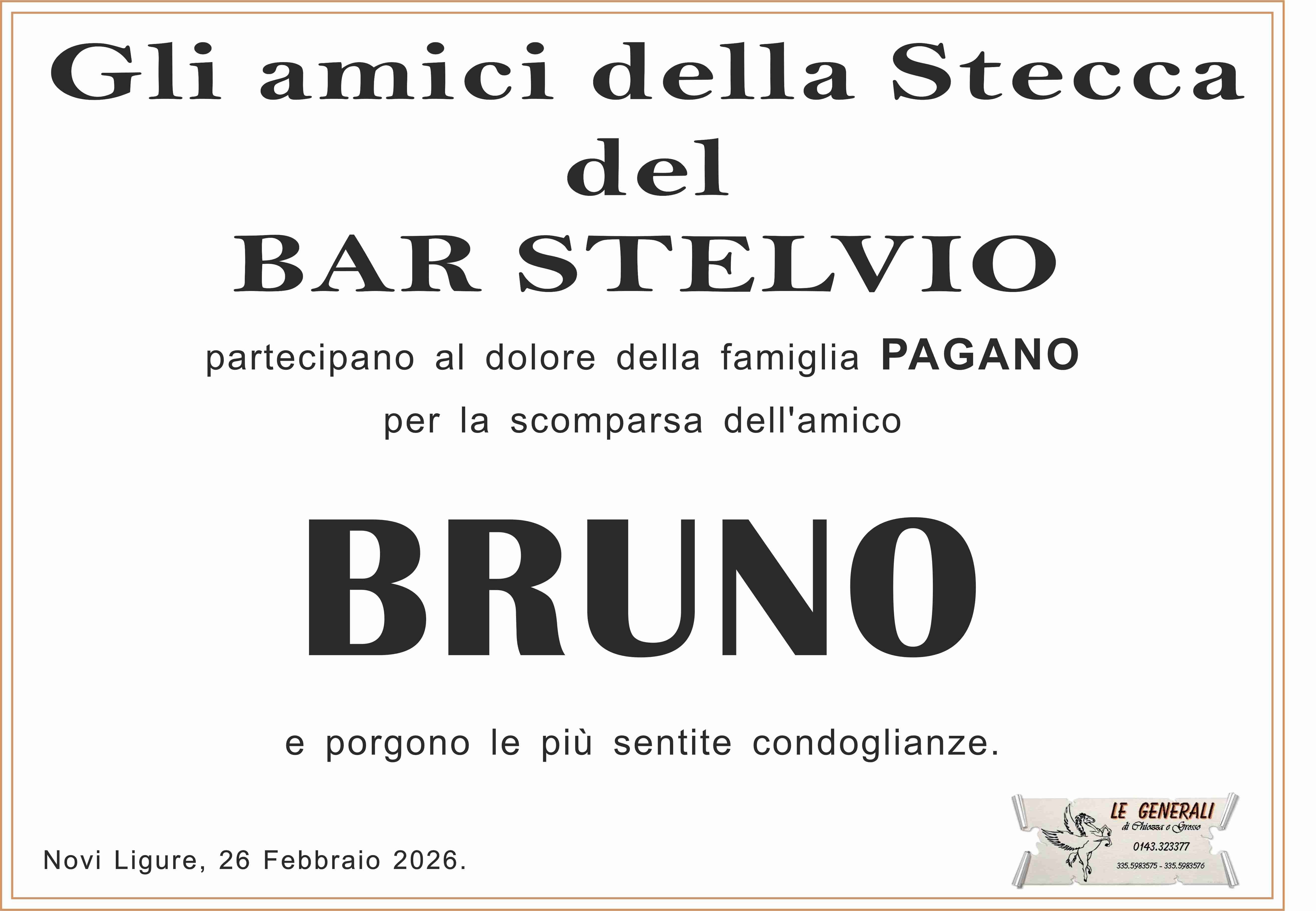Colpito dall'improvviso lutto, porgo le più sentite condoglianze alla famiglia tutta dell'amico Bruno nel ricordo della fattiva collaborazione presso la Federazione Pensionati Novi Ligure
