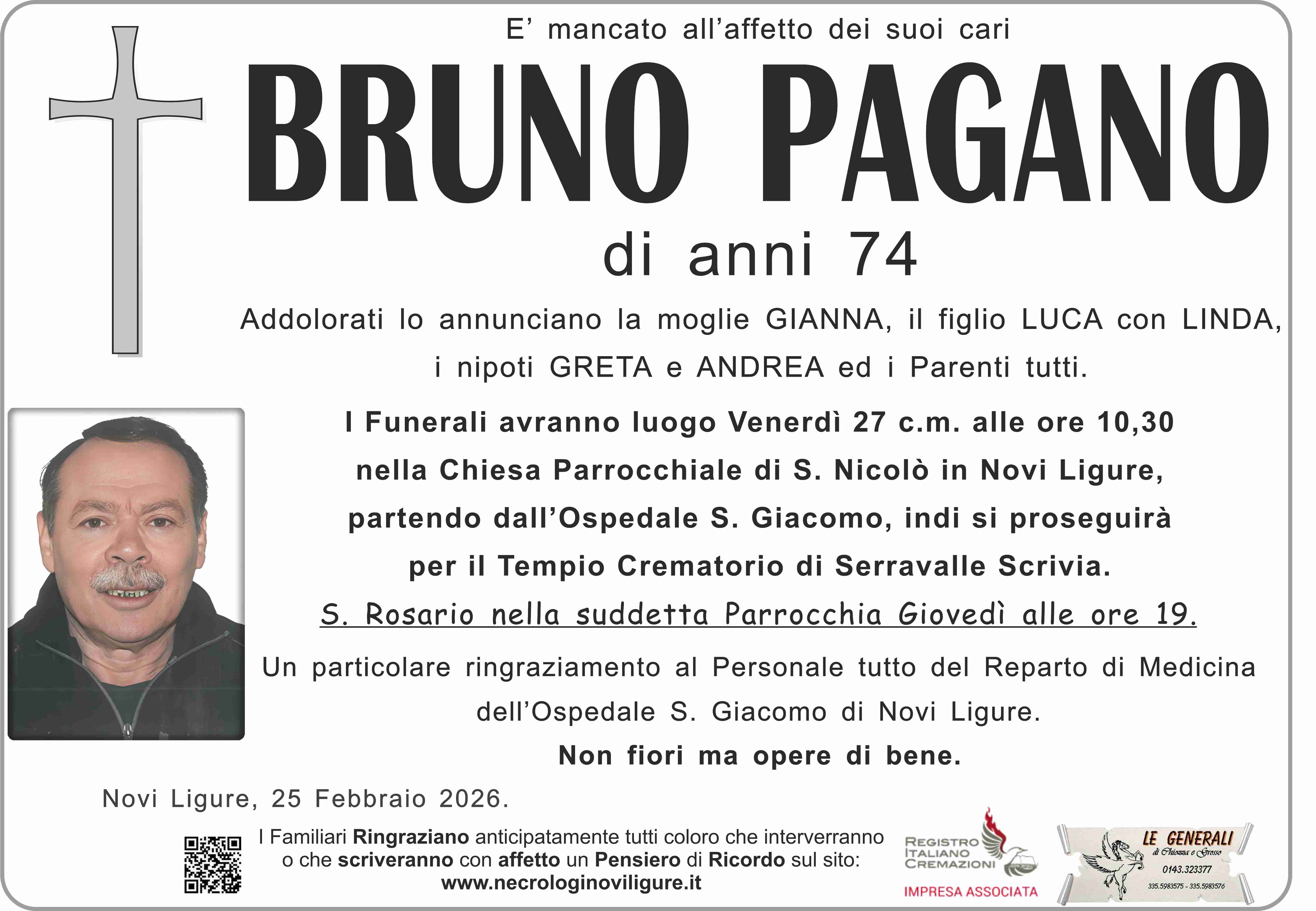 Caro Bruno ci hai lasciato in silenzio. Voglio ricordare,un amico di tante lotte e iniziative sindacali. Nei momenti difficili non mancava la tua verve e il tuo sorriso.Caro amico riposa in pace. A nome mio personale e della Uilp di Novi ,porgo sentite condoglianze ai tuoi cari.