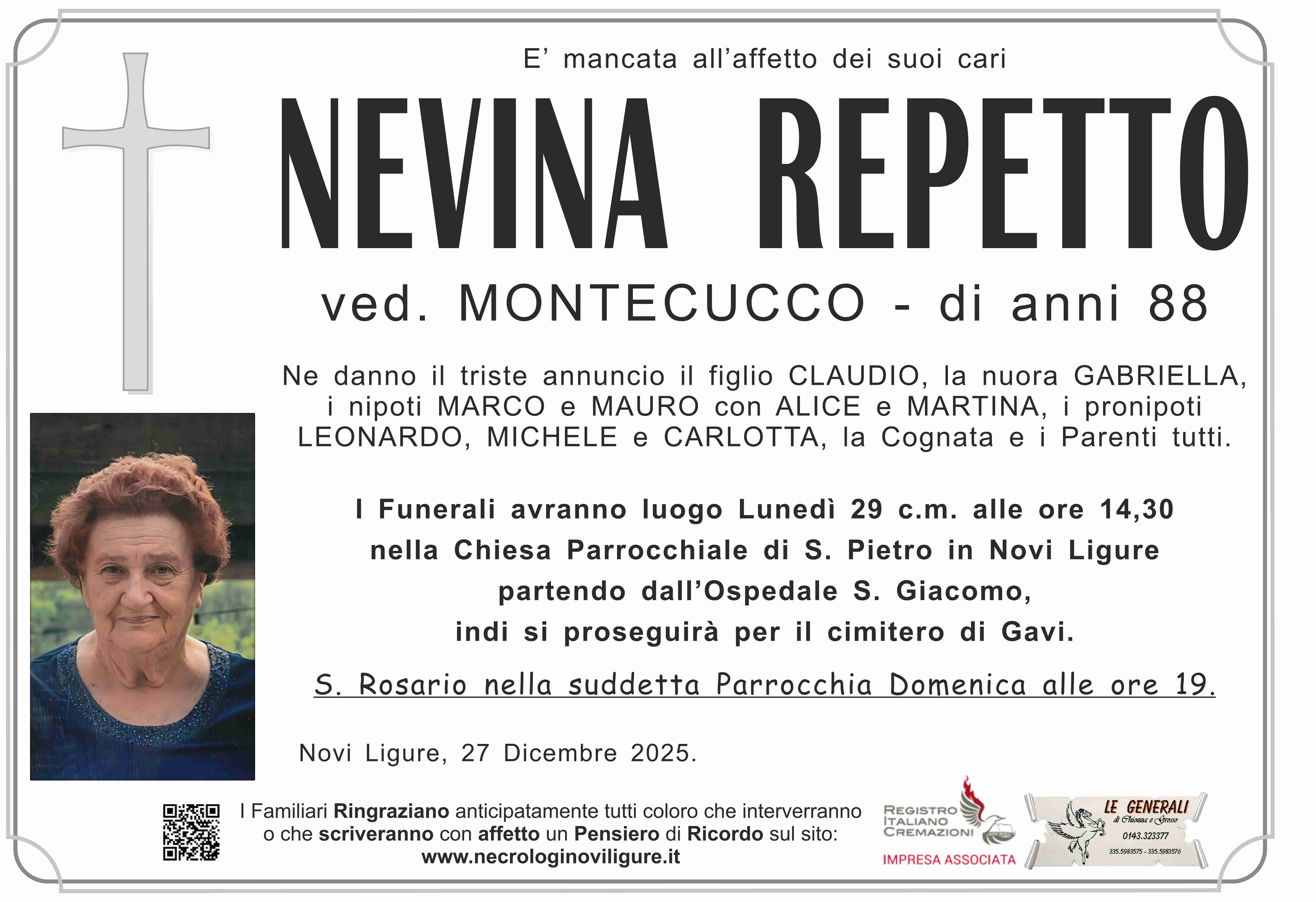 Cara Nevina, per me è stato un piacere conoscerti, mi hai accolto nella tua casa, ho avuto il privilegio di viverti nella quotidianità. Quante parole in quegli sguardi. Quanti aneddoti che ora sono ricordi. Sei stata la nonna per tutti. Da una sillaba si capiva subito il tuo umore, ancora un paio di giorni fa abbiamo riso perché ti ho detto che da vecchia sarò così, come te, testona ma schietta, una Repetto fatta e finita. Ora riposa e veglia sui tuoi amati nipoti e sui bambini.