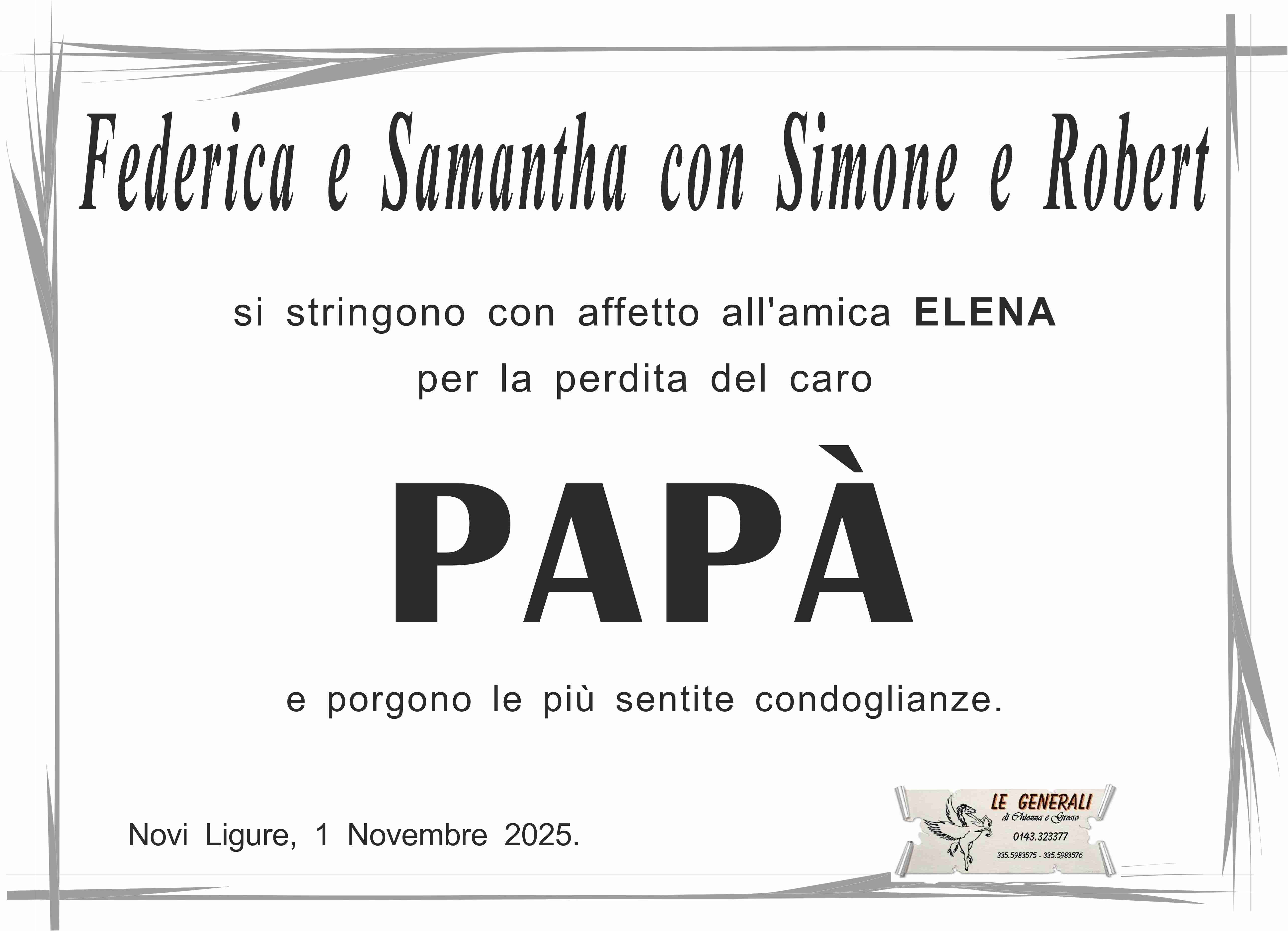 Cara Elena, dispiaciuto per la notizia della morte del papà, che ricordo con affetto e parte di un bel tempo passato insieme, sono vicino con il pensiero a te e mamma in questo triste momento. Un sentito abbraccio.