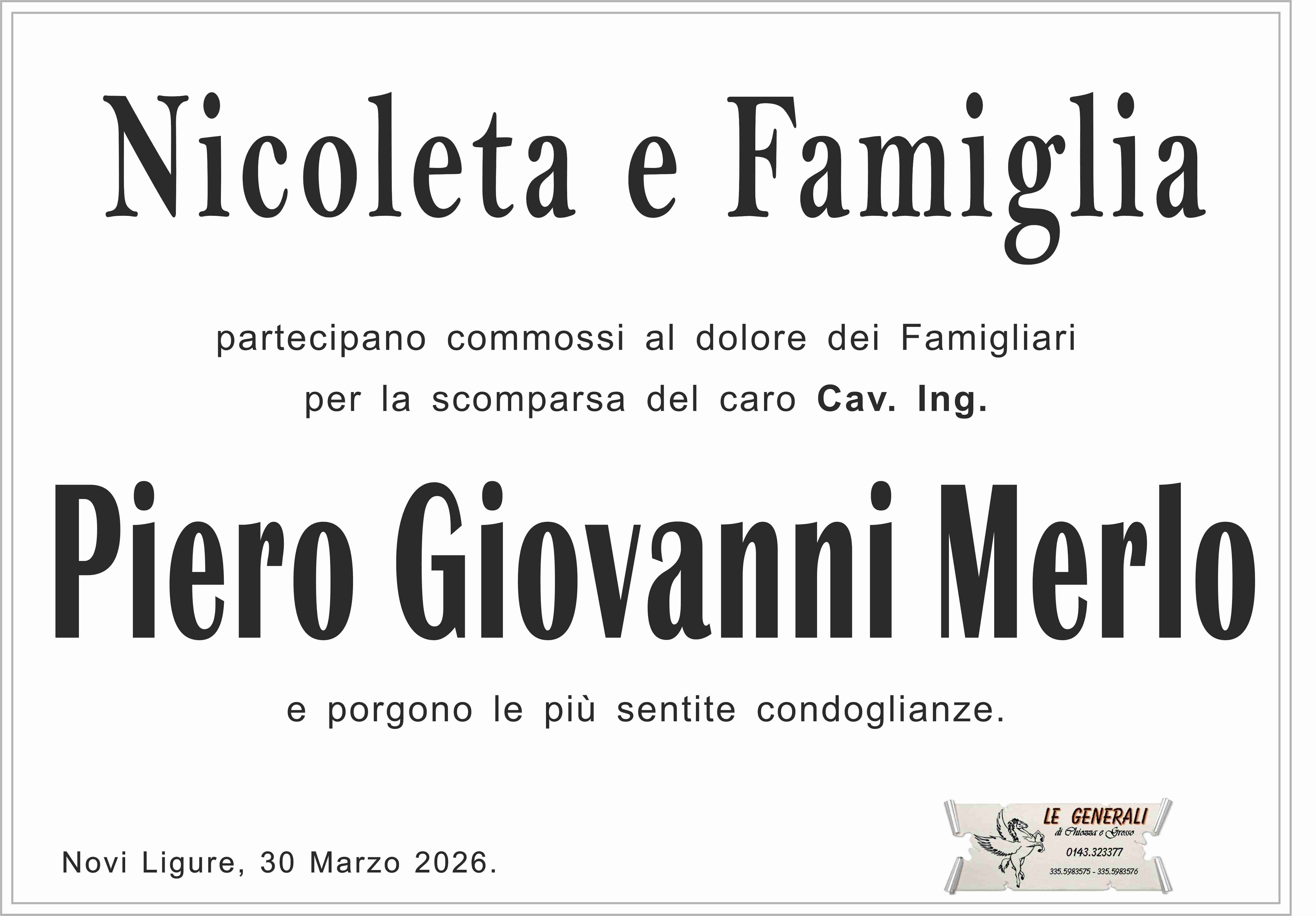 Paola e tutto il centro fisioterapico porgono le più sentite condoglianze alla signora Gianna e alla figlia Simona Per la perdita dell cav. Ing Giovanni Merlo