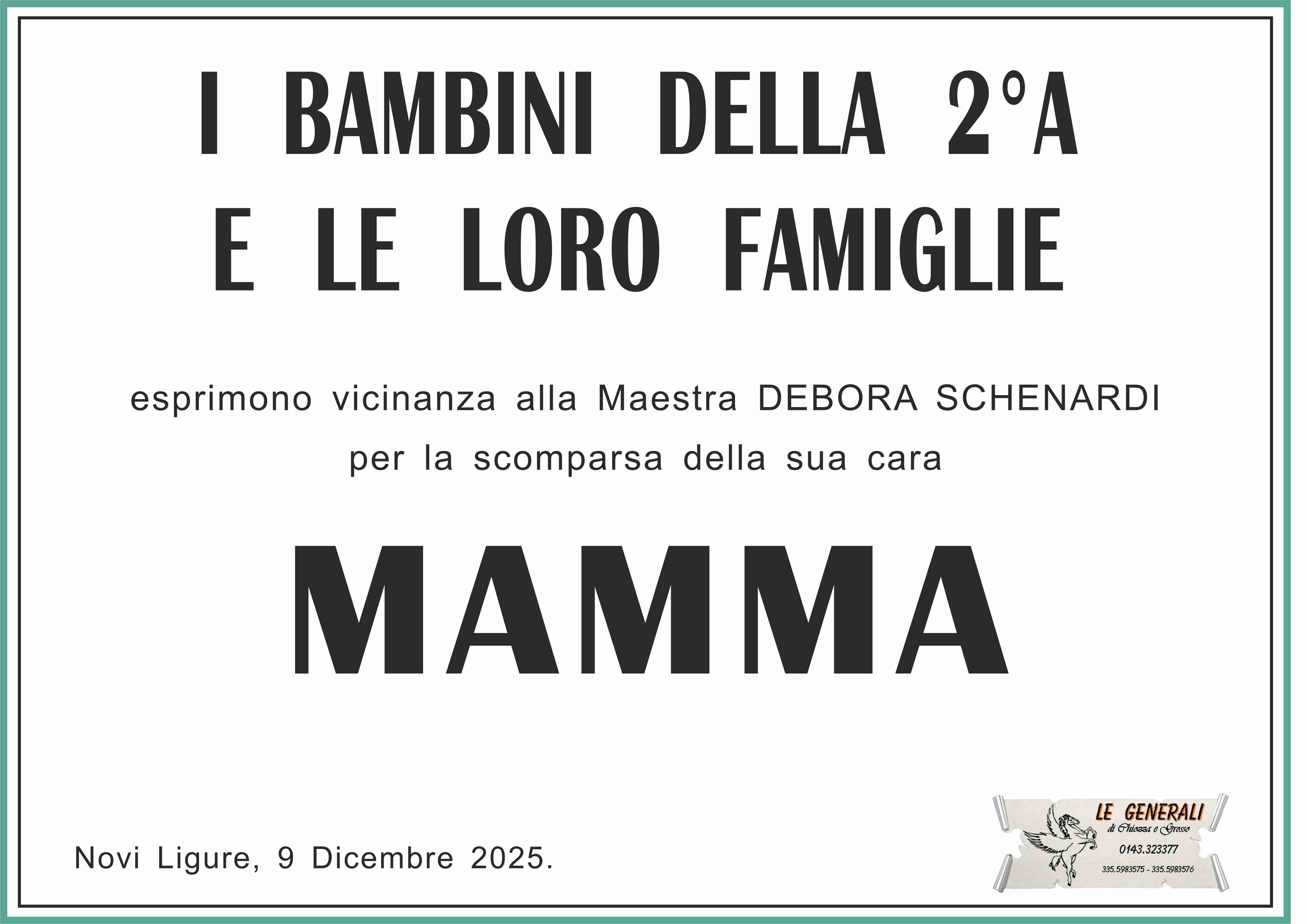 Le nostre più sentite condoglianze per il lutto che ha colpito la vostra famiglia. Un grande abbraccio alla maestra Debora. (Amanda e i genitori Anna e Massimiliano).