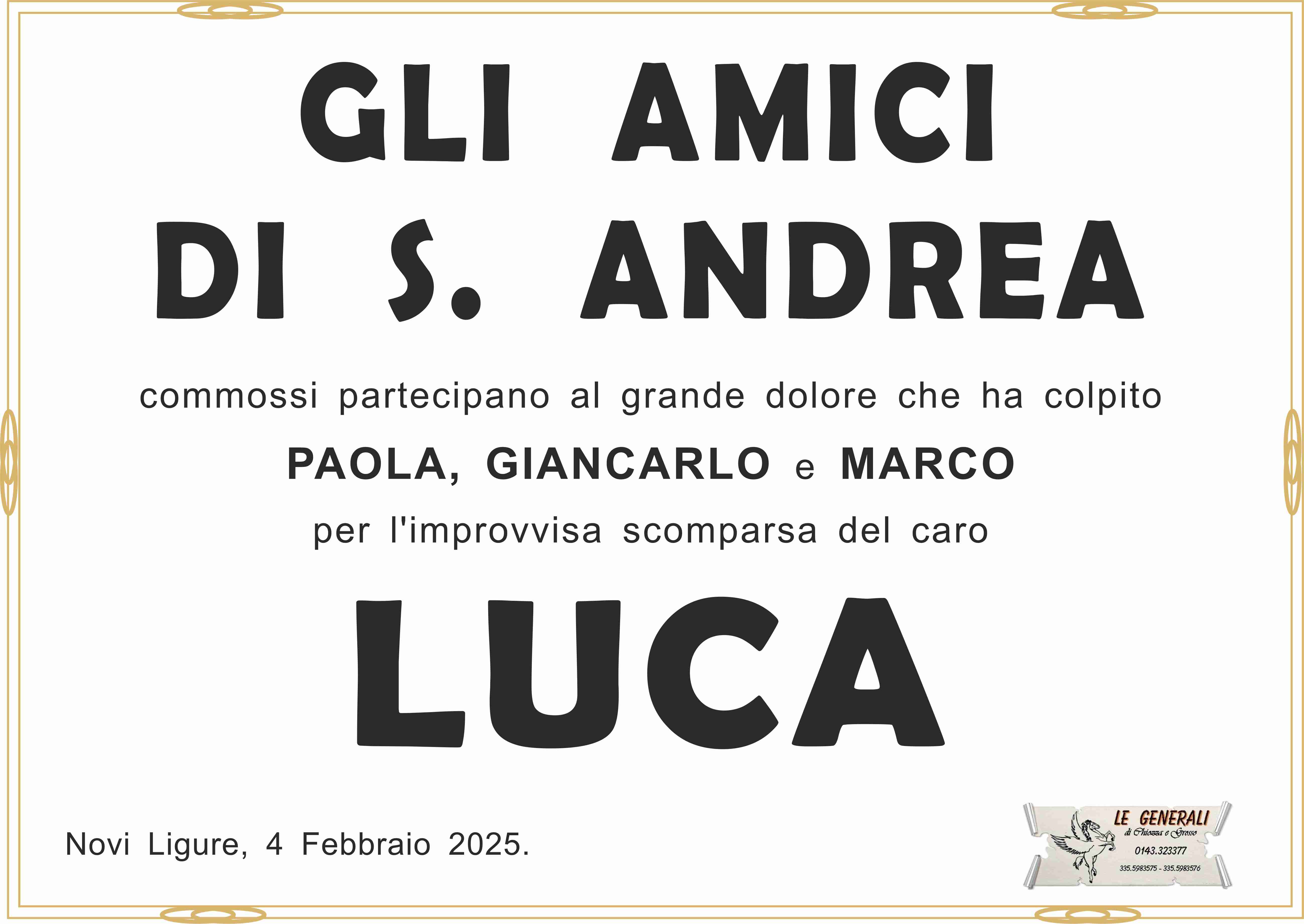Un abbraccio forte a Paola, Gian Carlo e Marco, vi siamo vicini in questo momento doloroso. Ciao Luca, il tuo ricordo rimarrà nei nostri cuori. Mariapia, Claudio e Matteo.