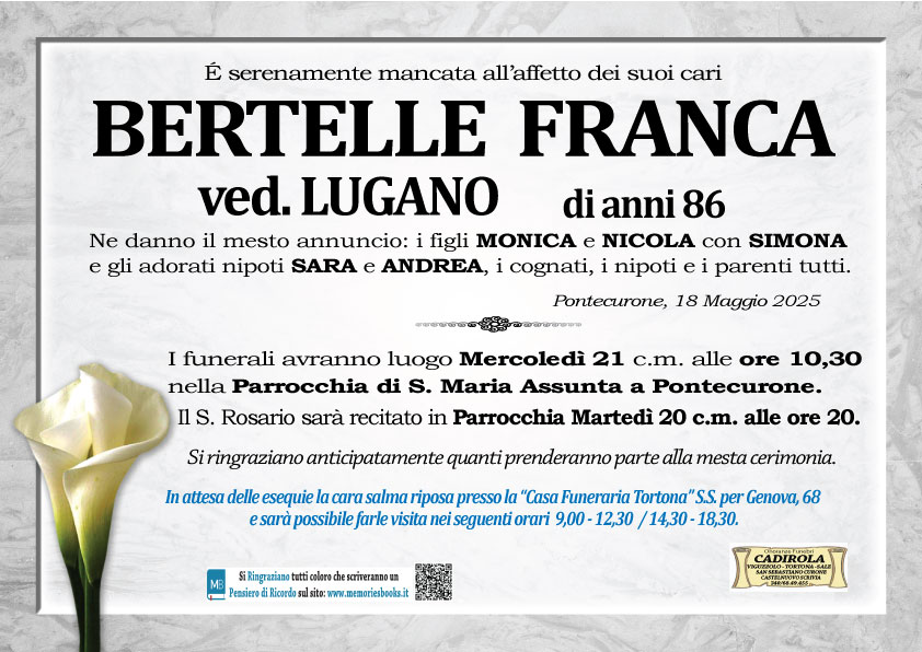 Nn ti conoscevo , ma ci univa la passione x il burraco e ieri abbiamo passato il tuo ultimo pomeriggio insieme..buon viaggio Franca...una preghiera x te...Sincere condoglianze ai familiari tutti..