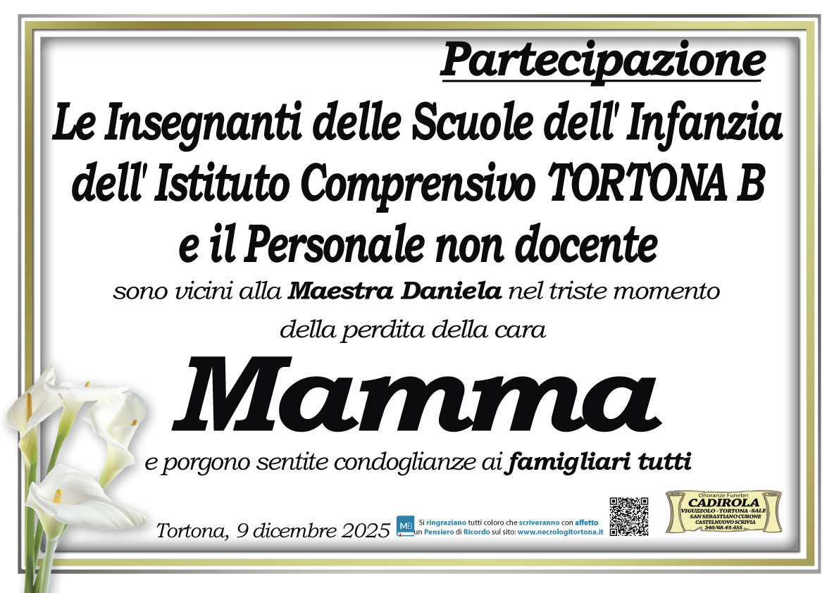 Nessuno può colmare il vuoto che si crea quando si perde la mamma. Prego Dio che consoli il tuo cuore e quello della tua famiglia per questa grave perdita. Sentite condoglianze a nome mio, delle colleghe e del personale tutto della Scuola dell'Infanzia di Villalvernia.
