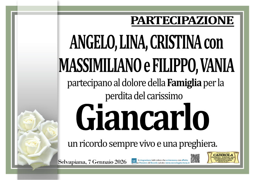Vi siamo vicini in questo momento di infinito dolore Cari Franca, Nadia, Walter, Antonio e Tutti ed a Te, oh Giancarlo, auguriamo di brillare ora in cielo accanto a Gesù ed ai Tuoi che Ti hanno preceduto. Morena