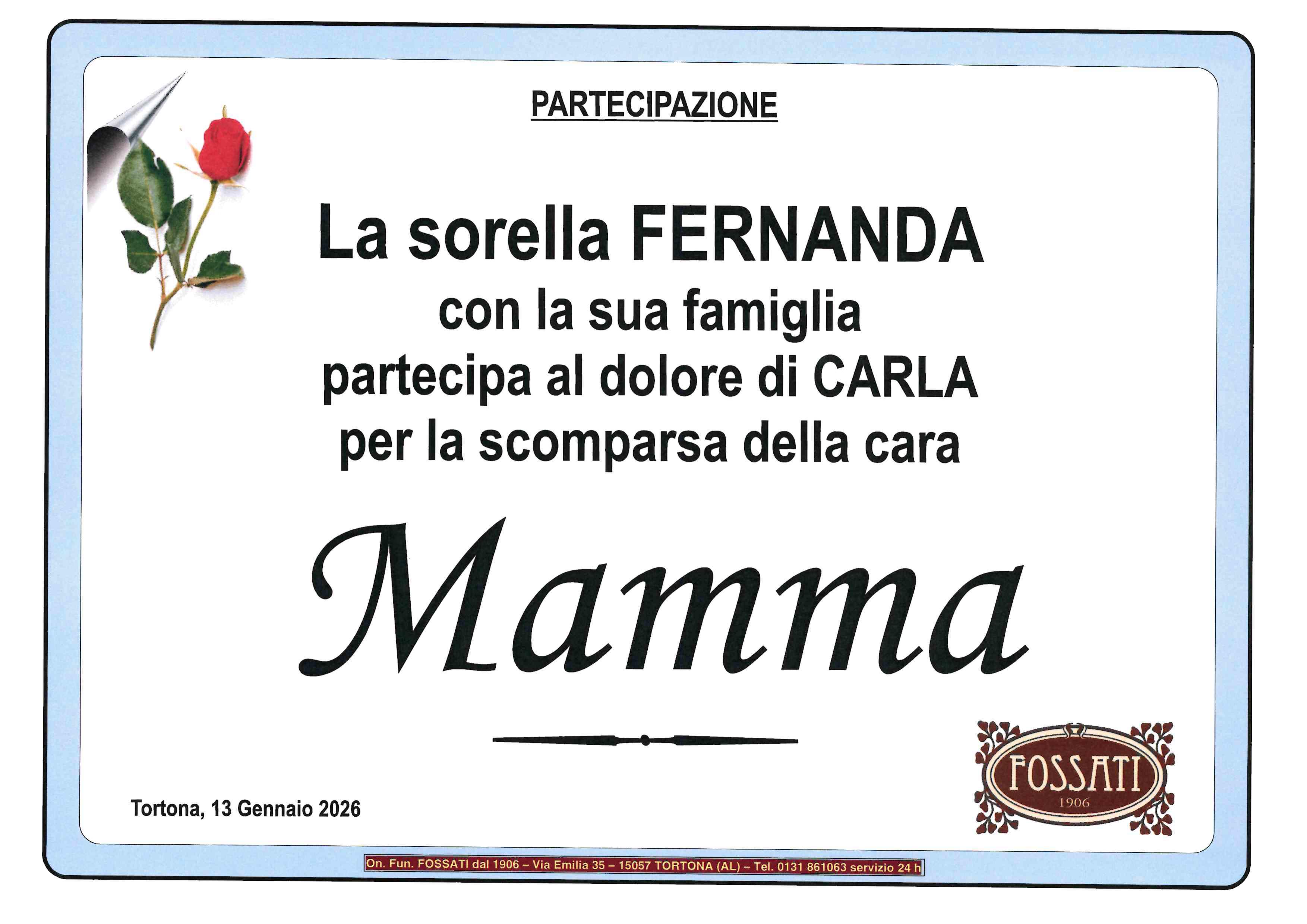 🌹La sorella Fernanda con Ugo , le figlie Orietta ,Egle con Edoardo e Carlo e Giampaolo si uniscono al dolore di Carla per la scomparsa della cara mamma, resterà sempre nei nostri cuori ♥️