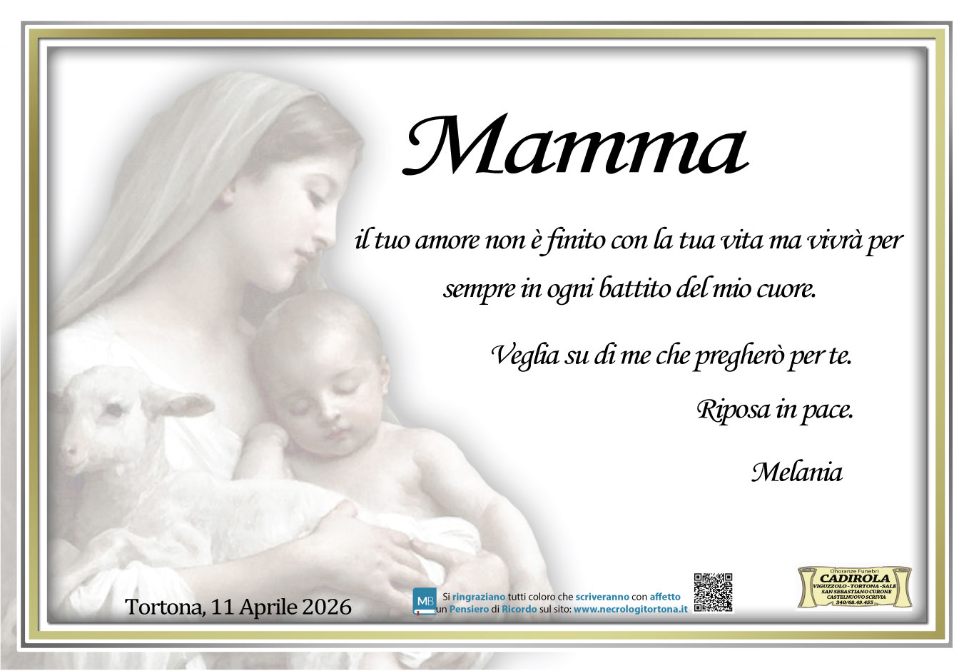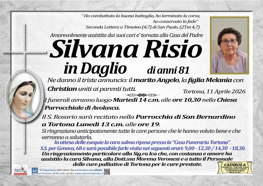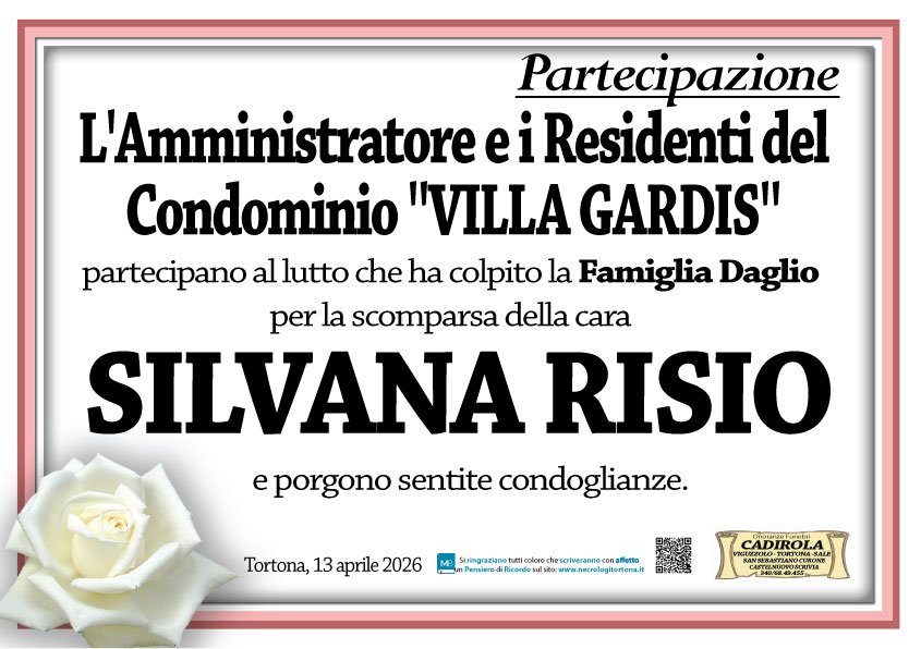 Caro Angelo e cara Melania,appresa la tristissima notizia,commossi,desideriamo Gianfranco ed io,porgervi le nostre più sentite condoglianze,impossibilitati a farlo personalmente perché fuori Tortona qualche giorno. Vicini a voi con la preghiera,un grande abbraccio. Marisa e Gianfranco Ricci