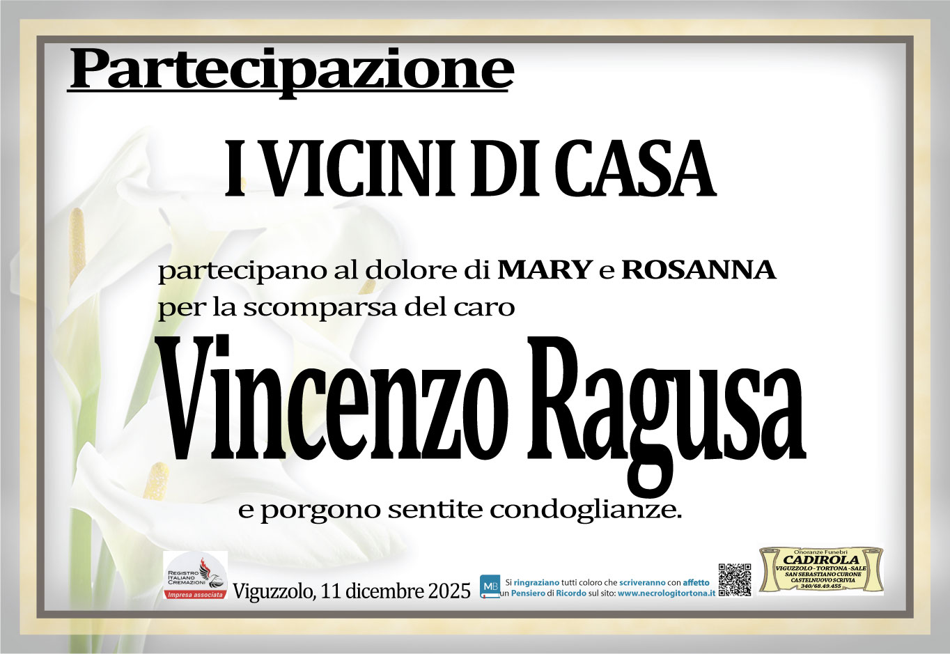 Tutta la famiglia dello zio Carmelo Ragusa si unisce con dolore alla perdita del nostro caro cugino Vincenzo Ragusa.Sentite condoglianze alla moglie Mary.