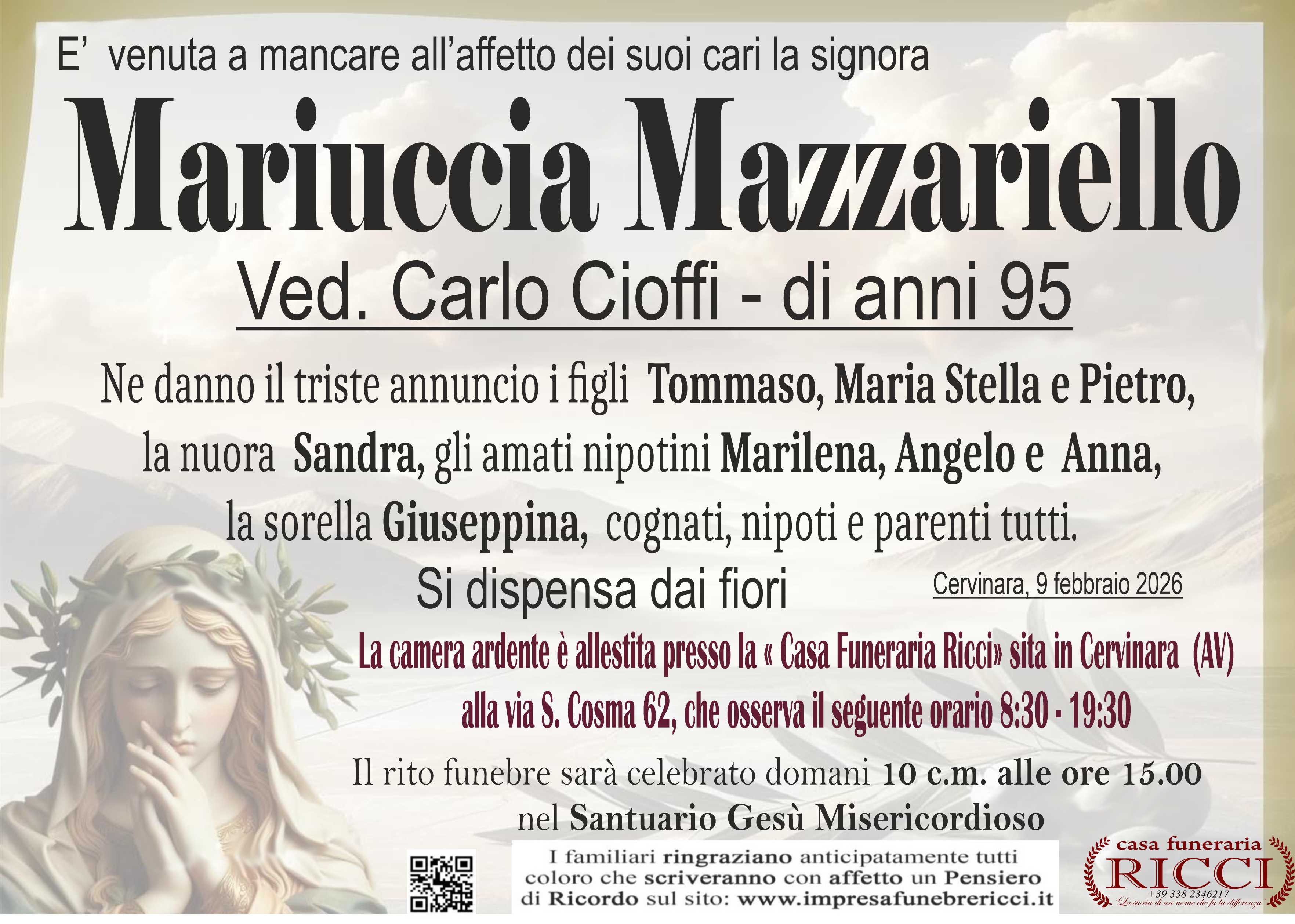 La camera ardente sarà allestita presso la Casa Funeraria Ricci