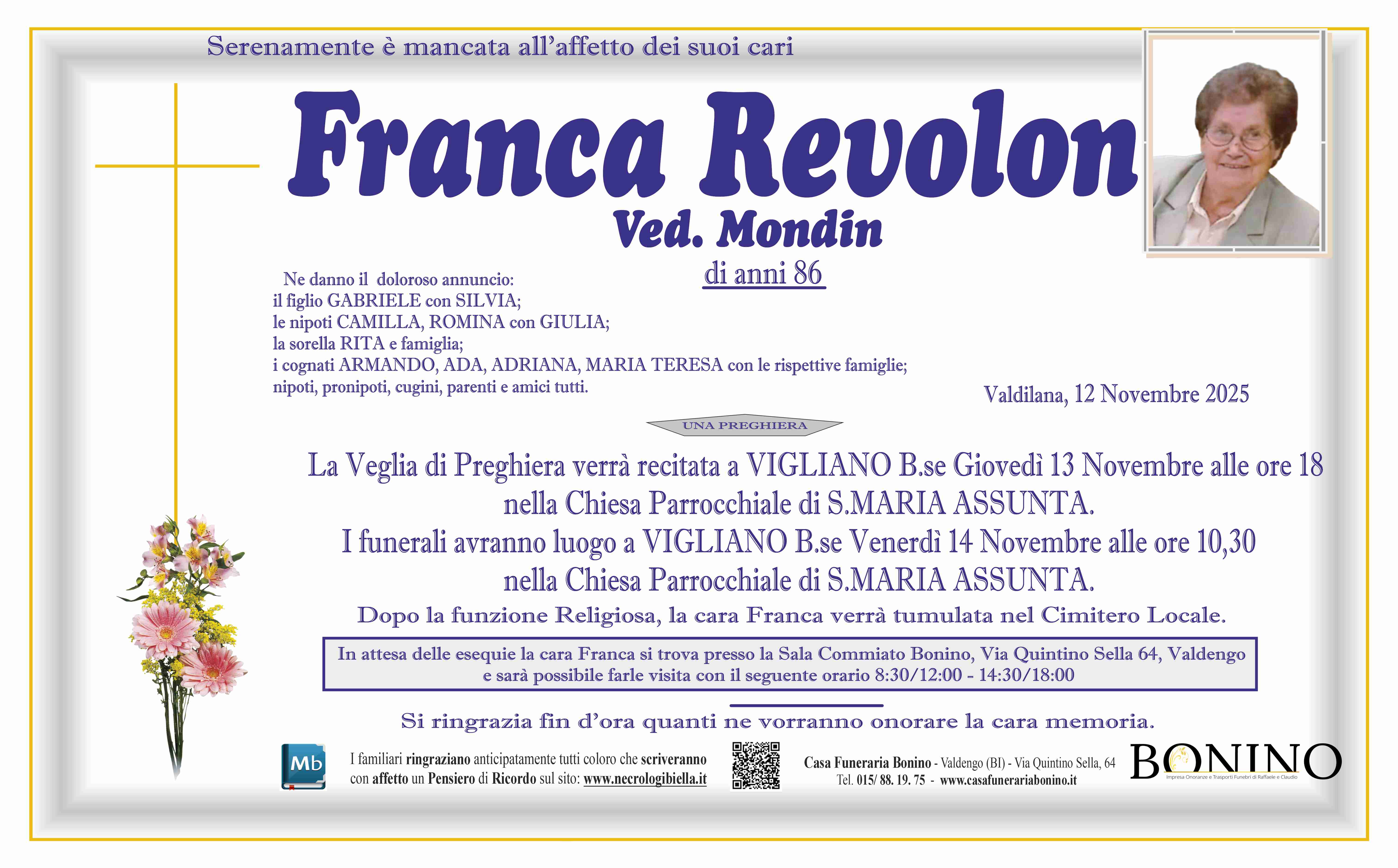 Carissima Franca che bei ricordi con tutti Voi qui in Veneto...Ora sei in paradiso con la tua amata Marina e tuo amato Aldo ...Ti giungano le ns. preghiere da noi Zia Maria Claudio Claudia e Patrizia Meneghin Un abbraccio a te Gabriele...