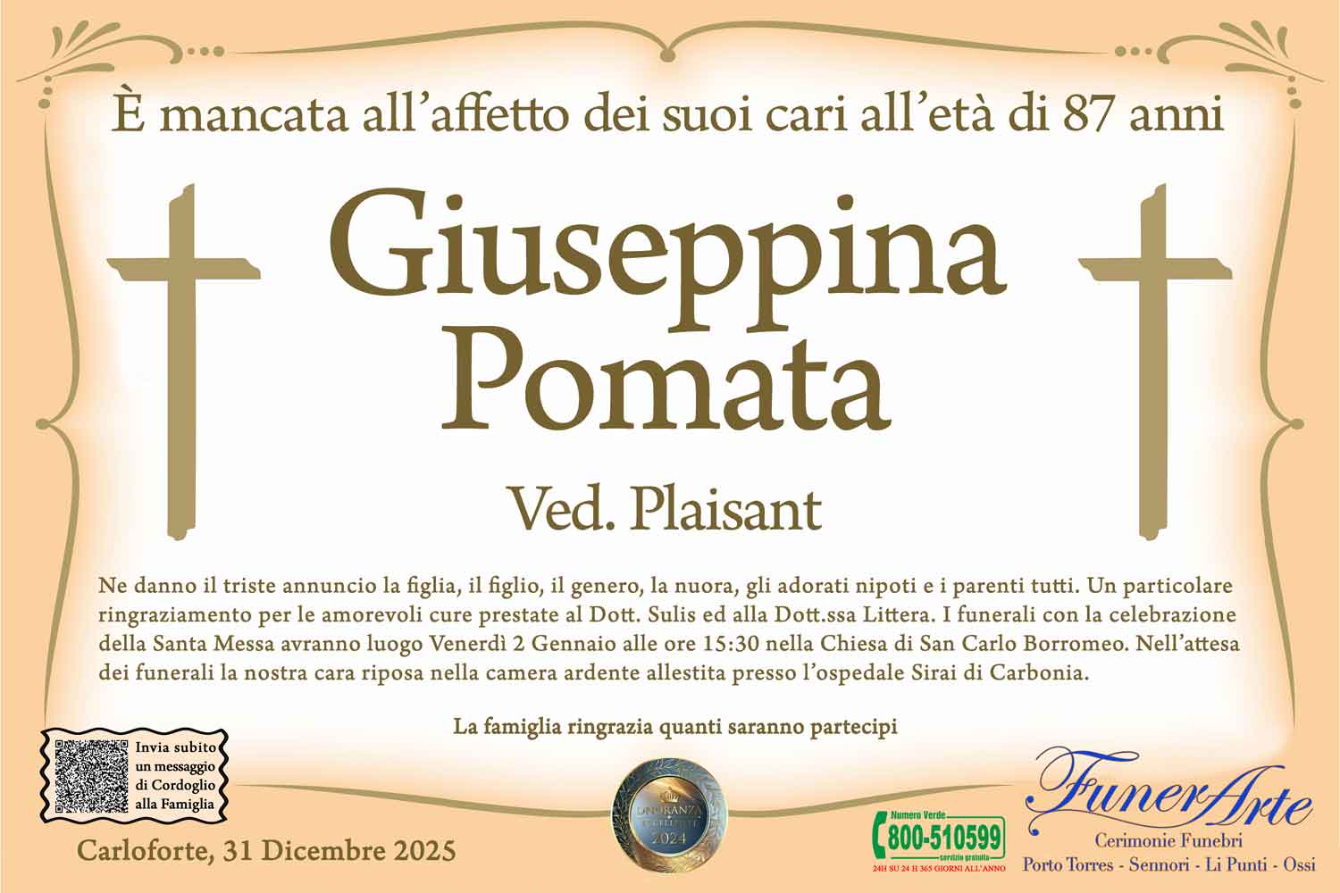 Ne danno il triste annuncio la figlia, il figlio, il genero, la nuora, gli adorati nipoti e i parenti tutti. Un particolare ringraziamento per le amorevoli cure prestate al Dott. Sulis ed alla Dott.ssa Littera. I funerali con la celebrazione della Santa Messa avranno luogo Venerdì 2 Gennaio alle ore 15:30 nella Chiesa di San Carlo Borromeo. Nell’attesa dei funerali la nostra cara riposa nella camera ardente allestita presso l’ospedale Sirai di Carbonia.
