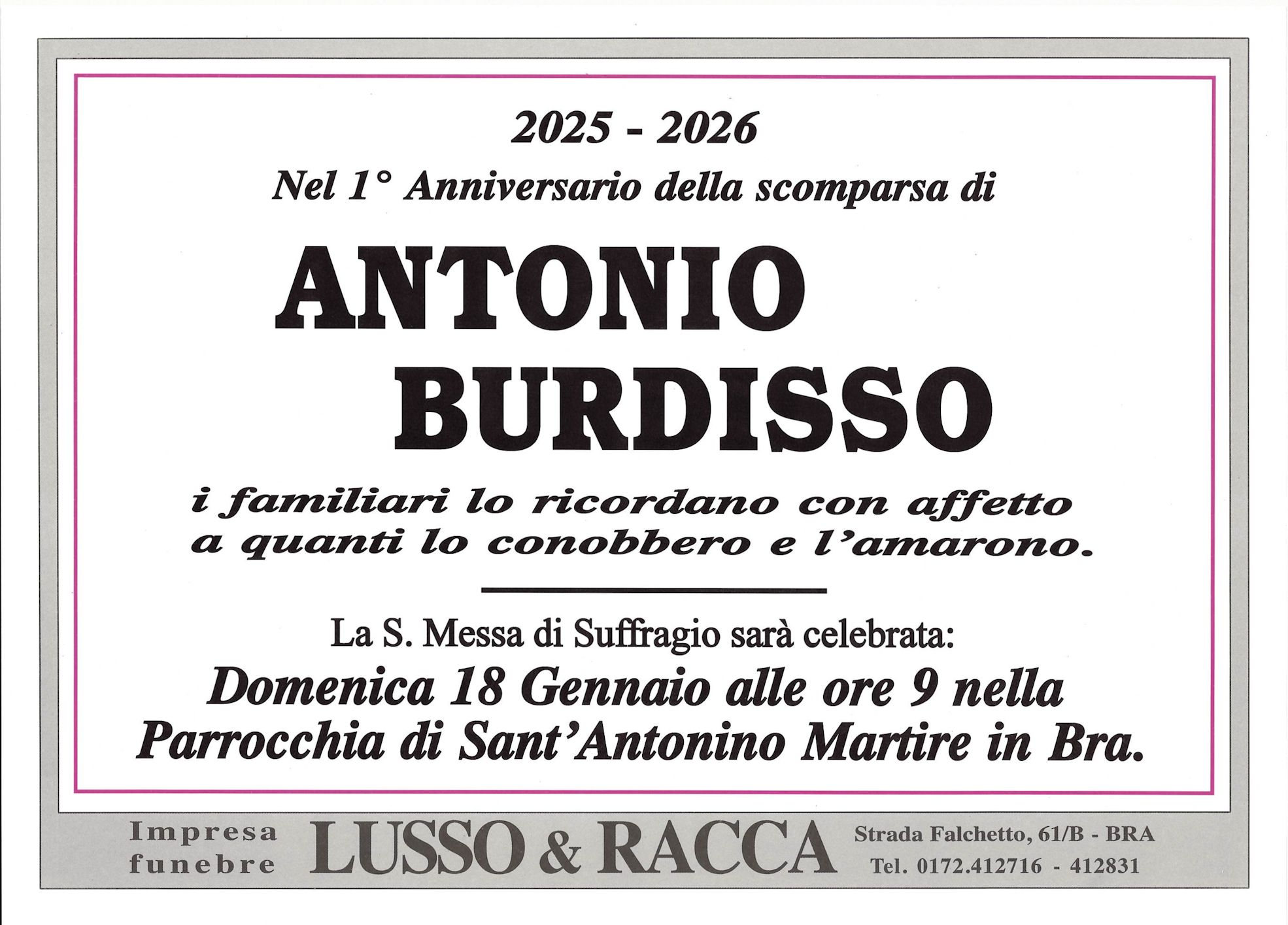Condoglianze alla famiglia del Caro Antonio Burdisso ... Condoglianze Claudio e alla Nipote Francesca ... Vi abbraccio forte forte.... Vi sono vicina con le parole di conforto... E vi sono vicina con le preghiere
