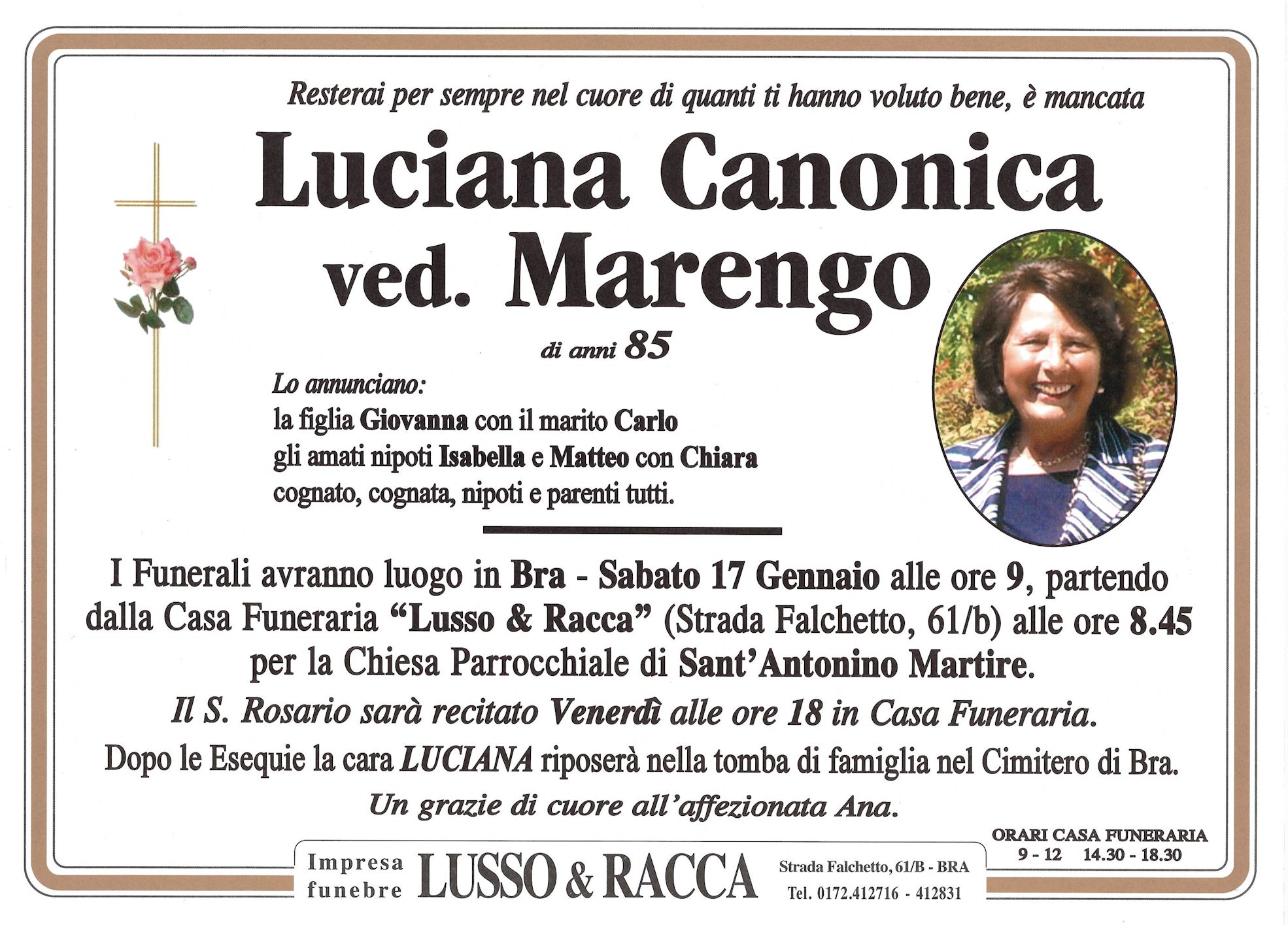 I familiari ringraziano anticipatamente tutti coloro che parteciperanno alla cerimonia funebre