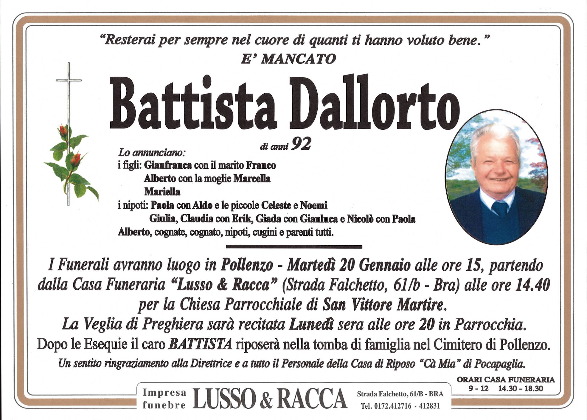 I familiari ringraziano anticipatamente tutti coloro che parteciperanno alla cerimonia funebre