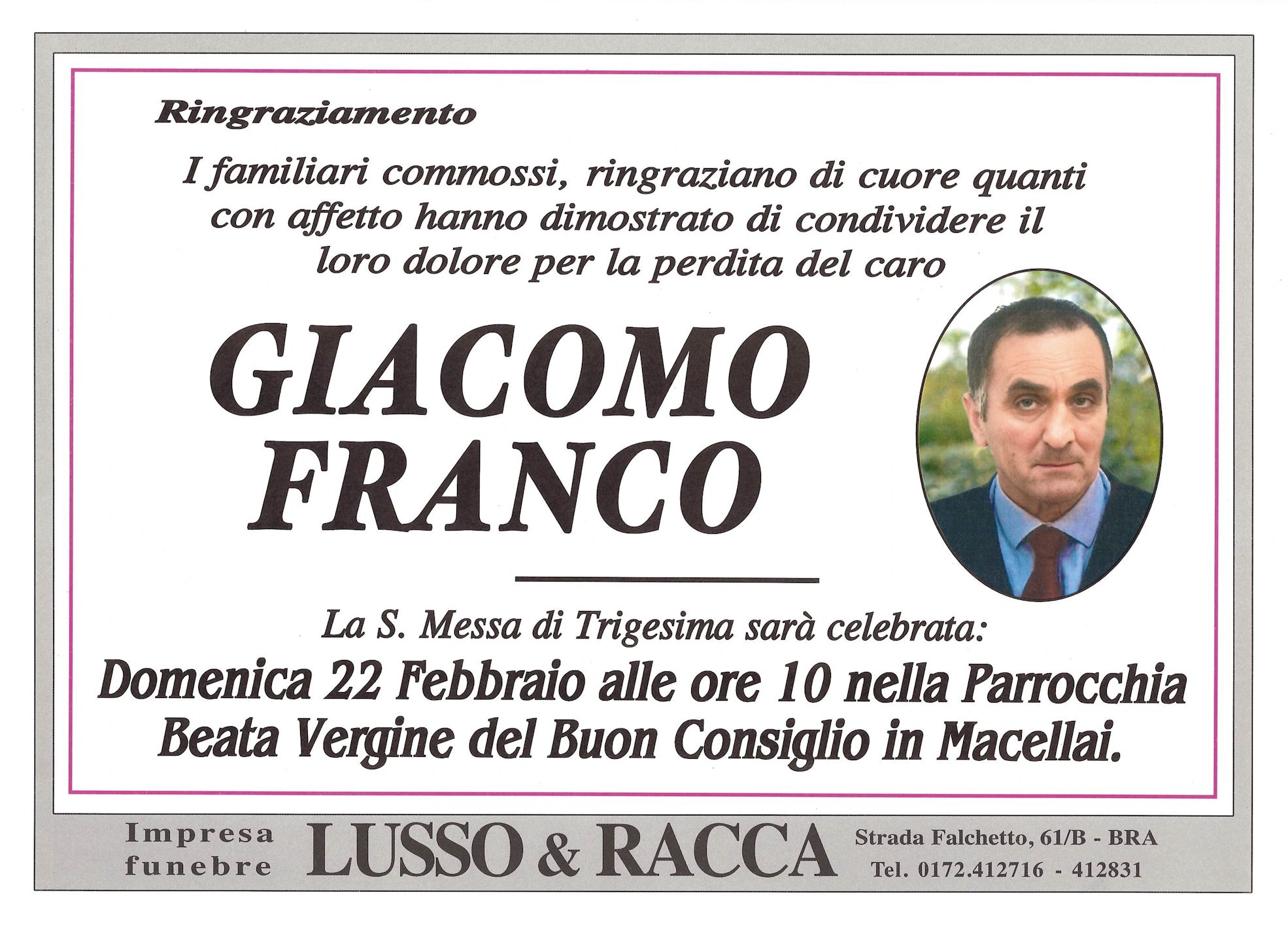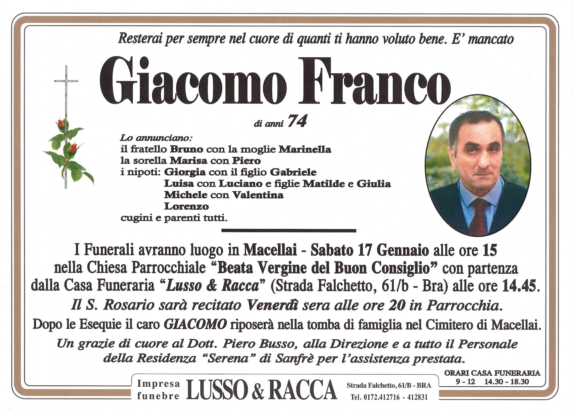 I familiari ringraziano anticipatamente tutti coloro che parteciperanno alla cerimonia funebre