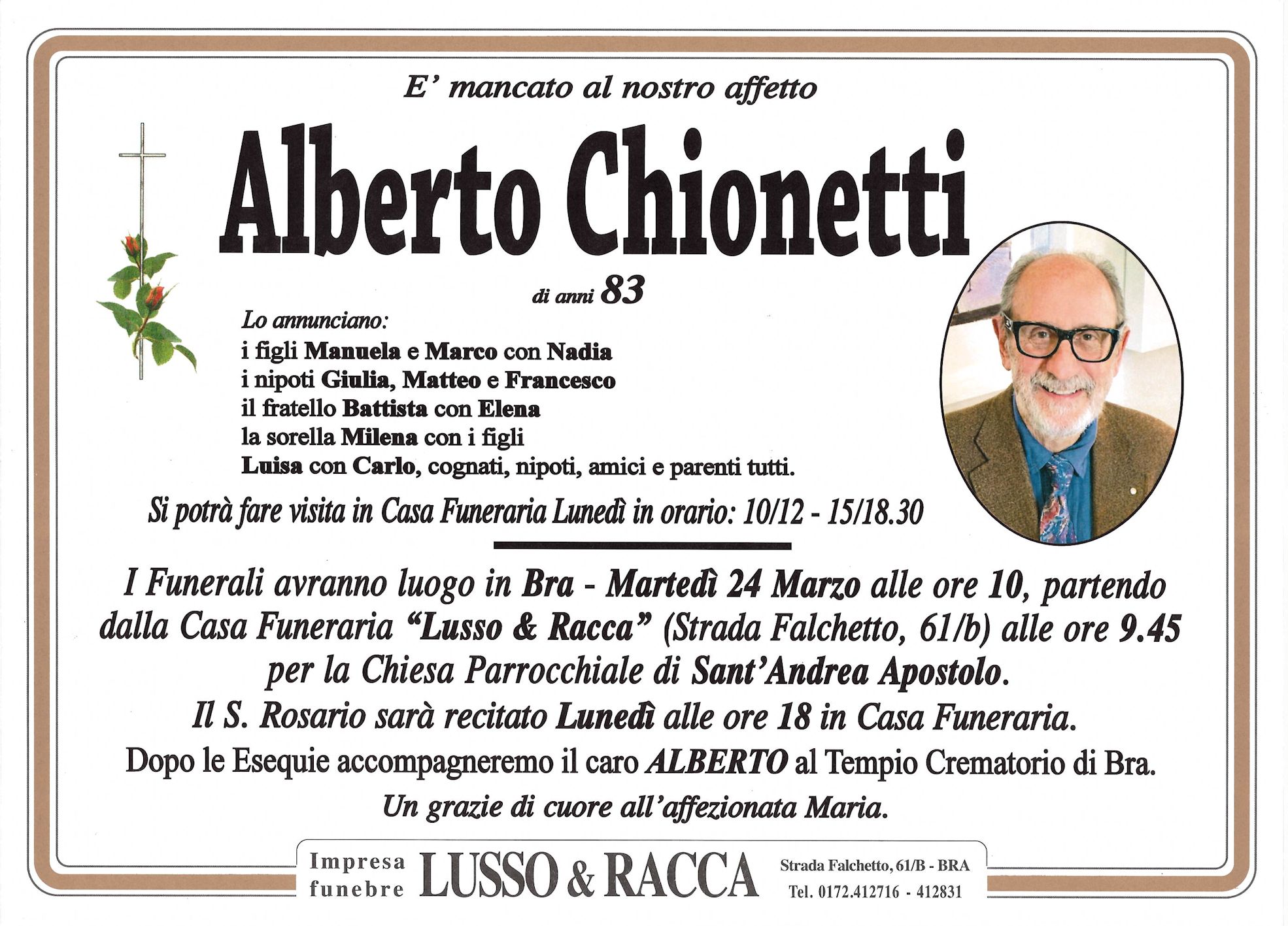 I familiari ringraziano anticipatamente tutti coloro che parteciperanno alla cerimonia funebre