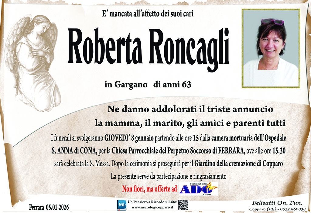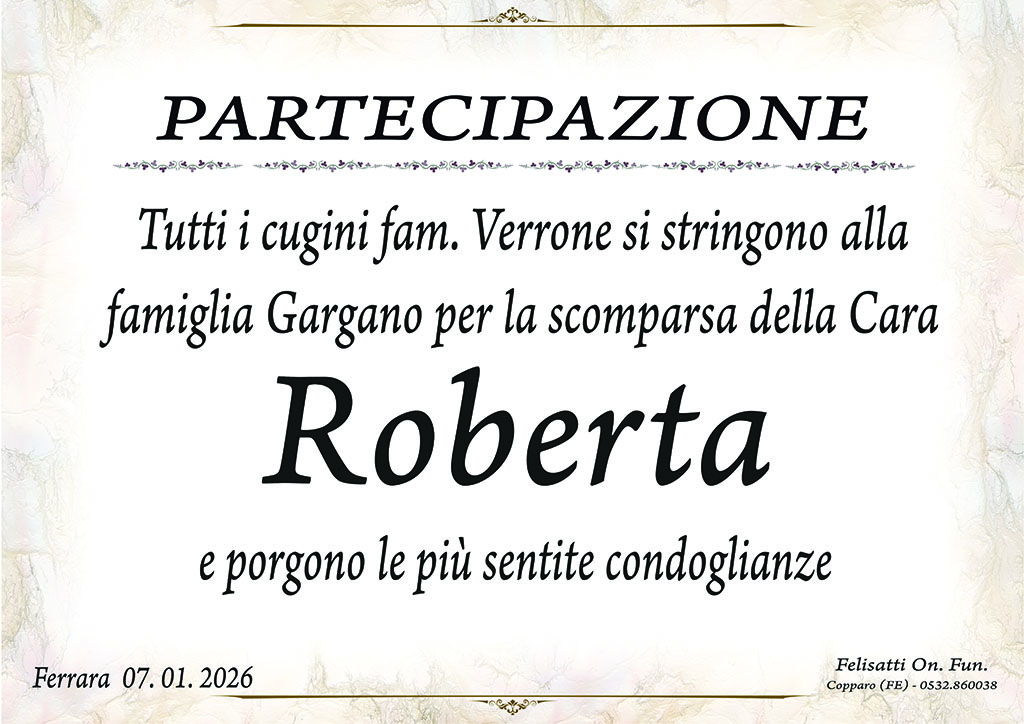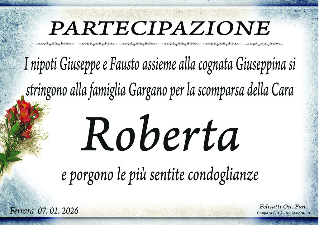 Donna di grande forza e straordinaria generosità, ha affrontato la malattia con coraggio, dignità e silenziosa determinazione. Anche nei momenti più difficili non ha mai smesso di pensare agli altri, mettendo sempre la famiglia davanti a tutto, donando aiuto, presenza e amore quando più ce n’era bisogno. Zia Roberta è stata un punto di riferimento nei momenti bui, una mano tesa nelle difficoltà, una voce capace di rassicurare anche nel dolore. Ha saputo sostenerci nei periodi più duri, senza mai chiedere nulla in cambio, con quella bontà sincera che solo le anime grandi possiedono. Il suo esempio di forza, altruismo e amore resterà per sempre inciso nei nostri cuori. Il vuoto che lascia è immenso, ma altrettanto grande è l’eredità di affetto, valori e ricordi che ci accompagneranno per tutta la vita. La famiglia la saluta con infinito amore, gratitudine e rispetto, certa che il suo spirito continuerà a vegliare su tutti noi.