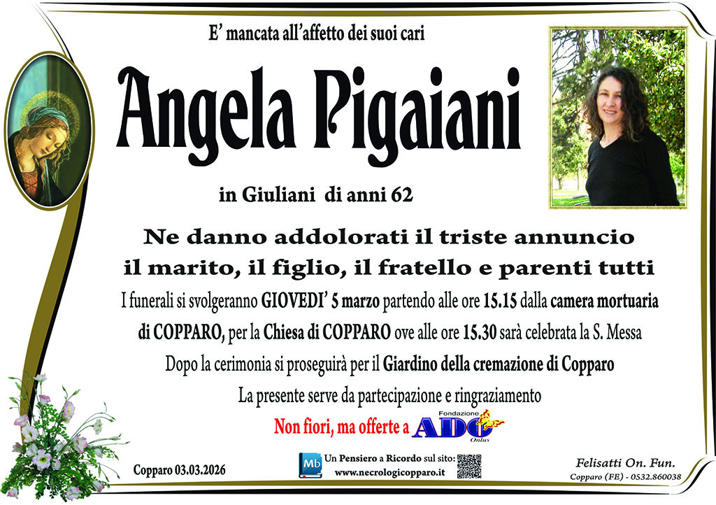 Ciao Angela, Caro amico Giuliano appreso della prematura scomparsa dell'amata moglie Angela, esprimo la mia autentica amicizia vicinanza fraterna amicizia a Te e famiglia in questo doloroso triste momento Sentite condoglianze Giovanni Mazzorana