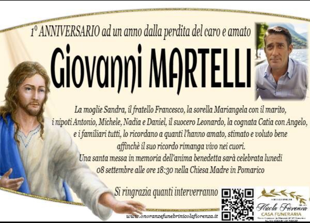 Mi associo al dolore che ha colpito la famiglia Martelli. Sentite condoglianze Luigi Salzano e Rosangela Quaranta