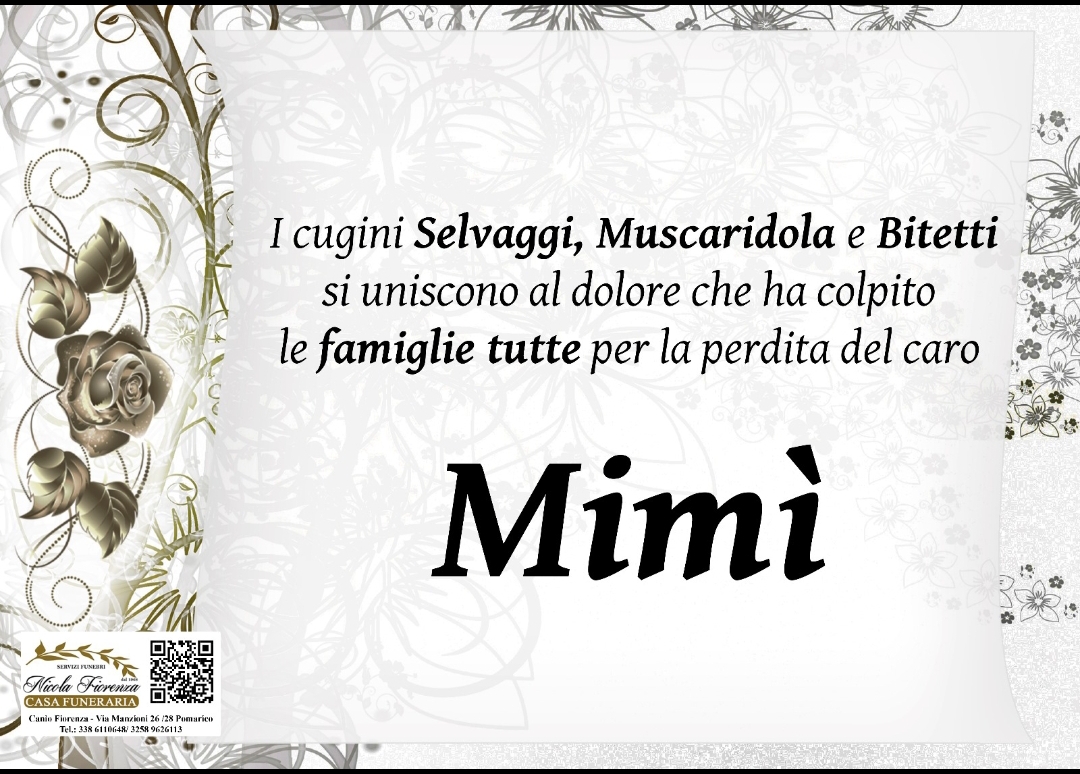 Apprendo con tanto dispiacere la notizia della scomparsa di de caro Mimì. Faccio le mie più sentite condoglianze a tutta la famiglia!!!
