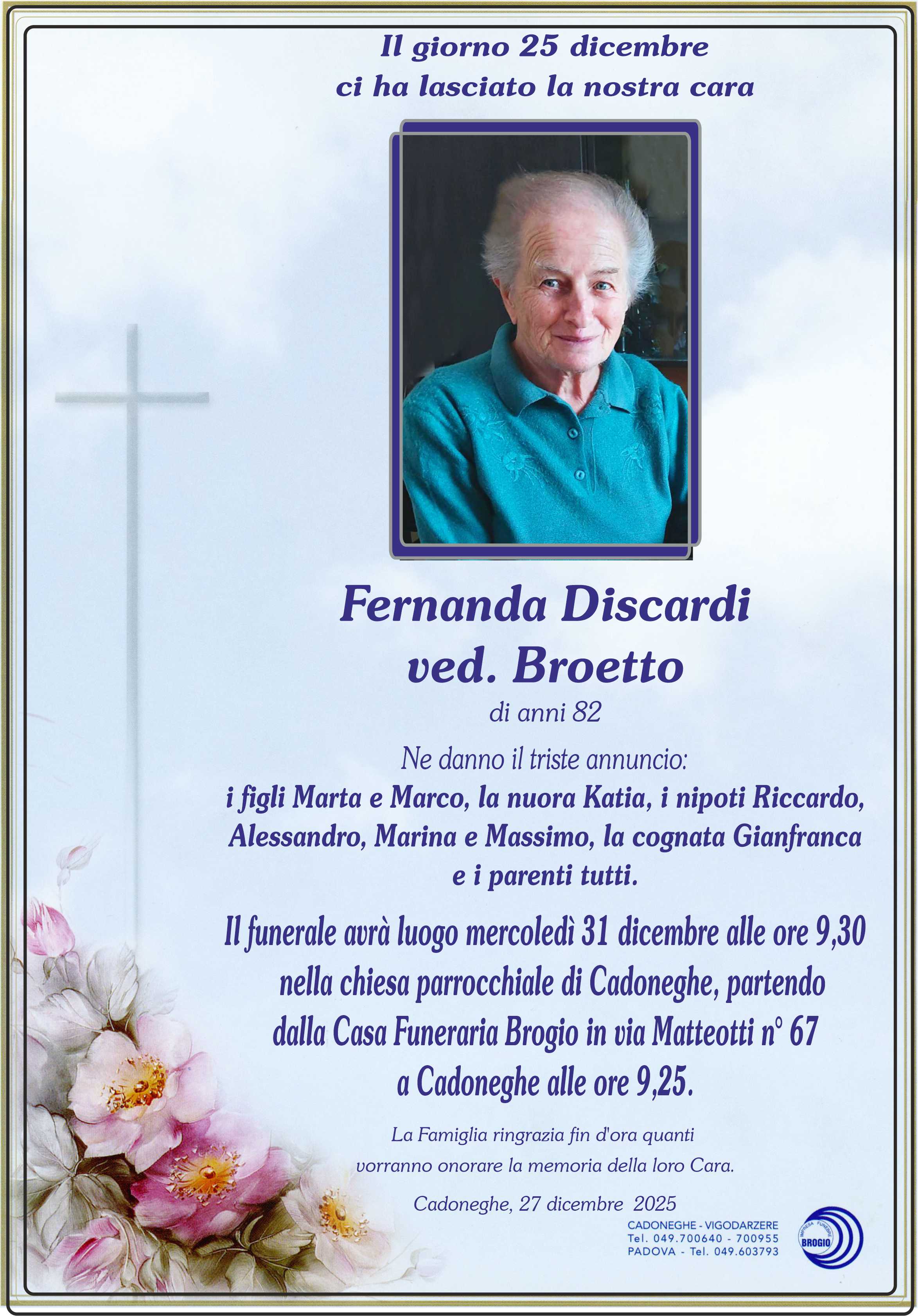 Sentite condoglianze alle famiglie Discardi e Broetto per la perdita della vostra cara Fernanda Un grande abbraccio alla figlia Marta. Zuanetto Alessandro.