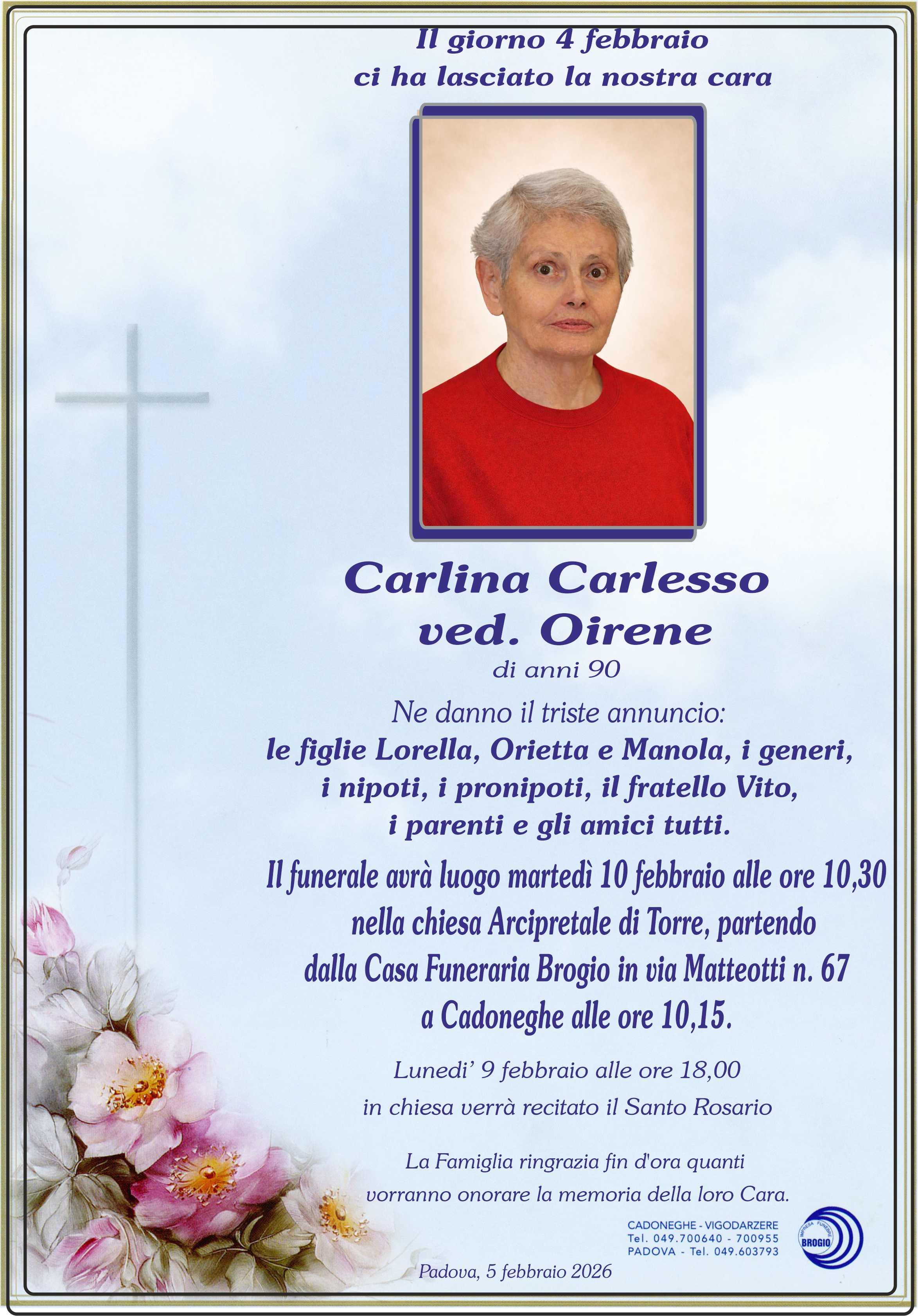 Essendo fuori Padova oggi e domani, Vi porgo le mie più sentite condoglianze. Sarà triste non poter più salutare da casa nostra Carlina.