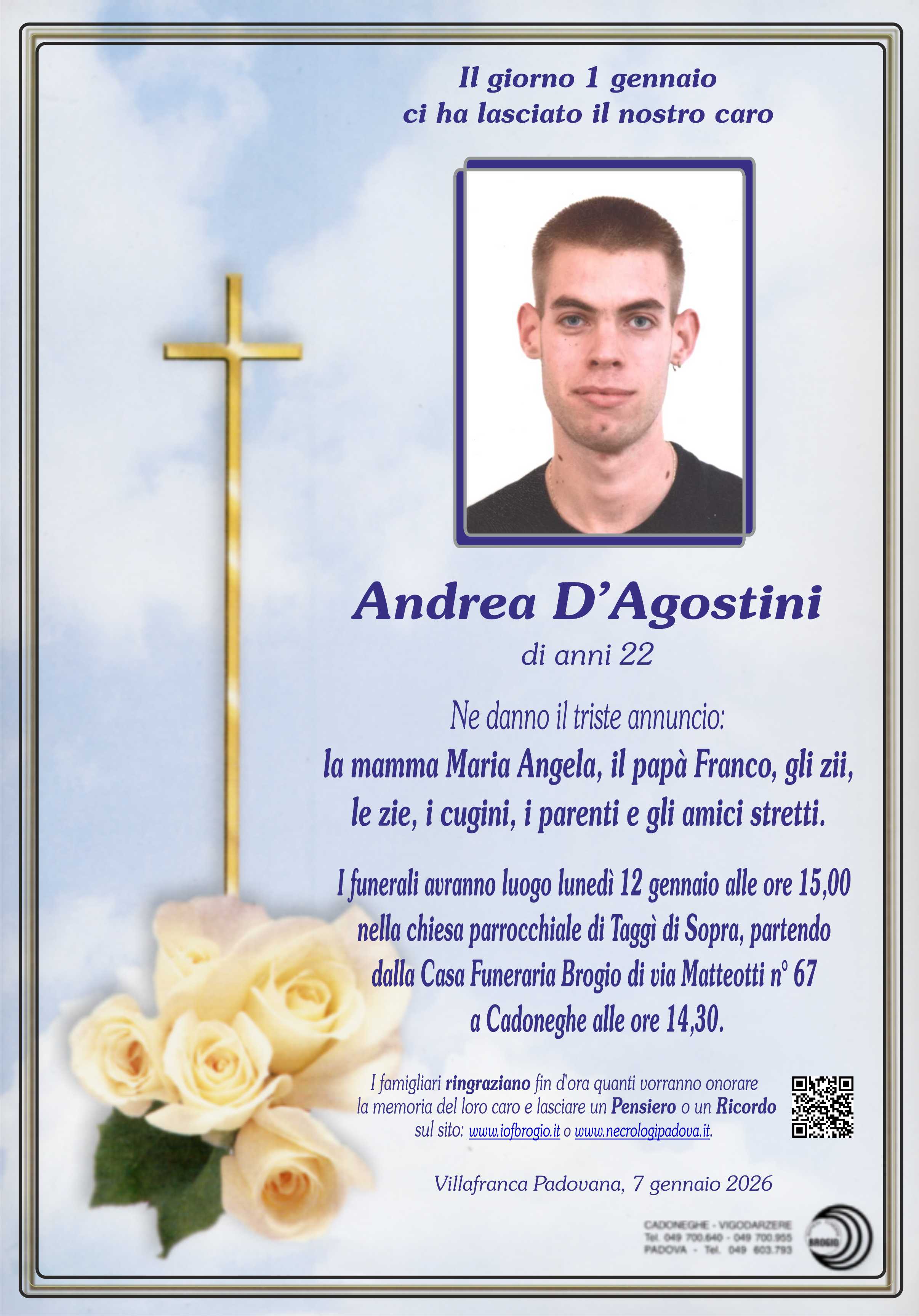 Ciao Andrea, ti ringraziamo per quello che sei stato e che in questa breve vita terrena ci hai lasciato. Grazie per la tua disponibilità, per essere stato sempre pronto ad aiutare la mia mamma Franca nei momenti di bisogno. Non ti dimenticheremo mai perché seppure nel tuo breve cammino hai saputo lasciare la tua impronta nel nostro cuore! Prega da lassù per i tuoi genitori e da' loro la forza di affrontare la vita anche senza di te! Ed ora vai e riposa in pace!