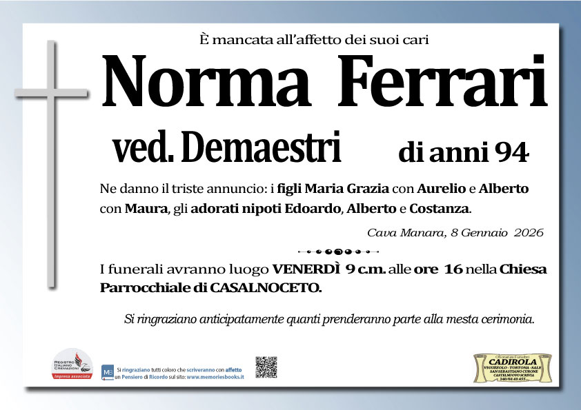 Carissimi Maria Grazia e Alberto, vi siamo vicini in questo momento di dolore per la perdita terrena della vostra cara mamma Norma ed esprimiamo a voi e alle vs. Famiglie sincere e sentite condoglianze. Il ricordo di Norma rimarrà sempre vivo nel nostro cuore, insieme a quello del caro Rino. Un abbraccio forte forte ed una preghiera.