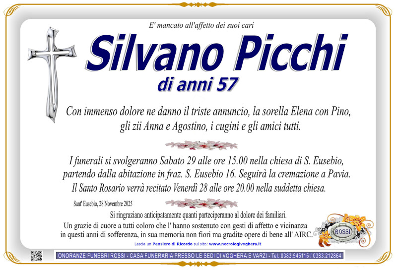 Ciao Silvano,il mio ricordo va alle scuole medie di Godiasco.Anima gentile e sempre sorridente,sentite condoglianze alla famiglia,purtroppo so cosa vuol dire perdere un fratello/sorella. Riposa in pace. Cristiana