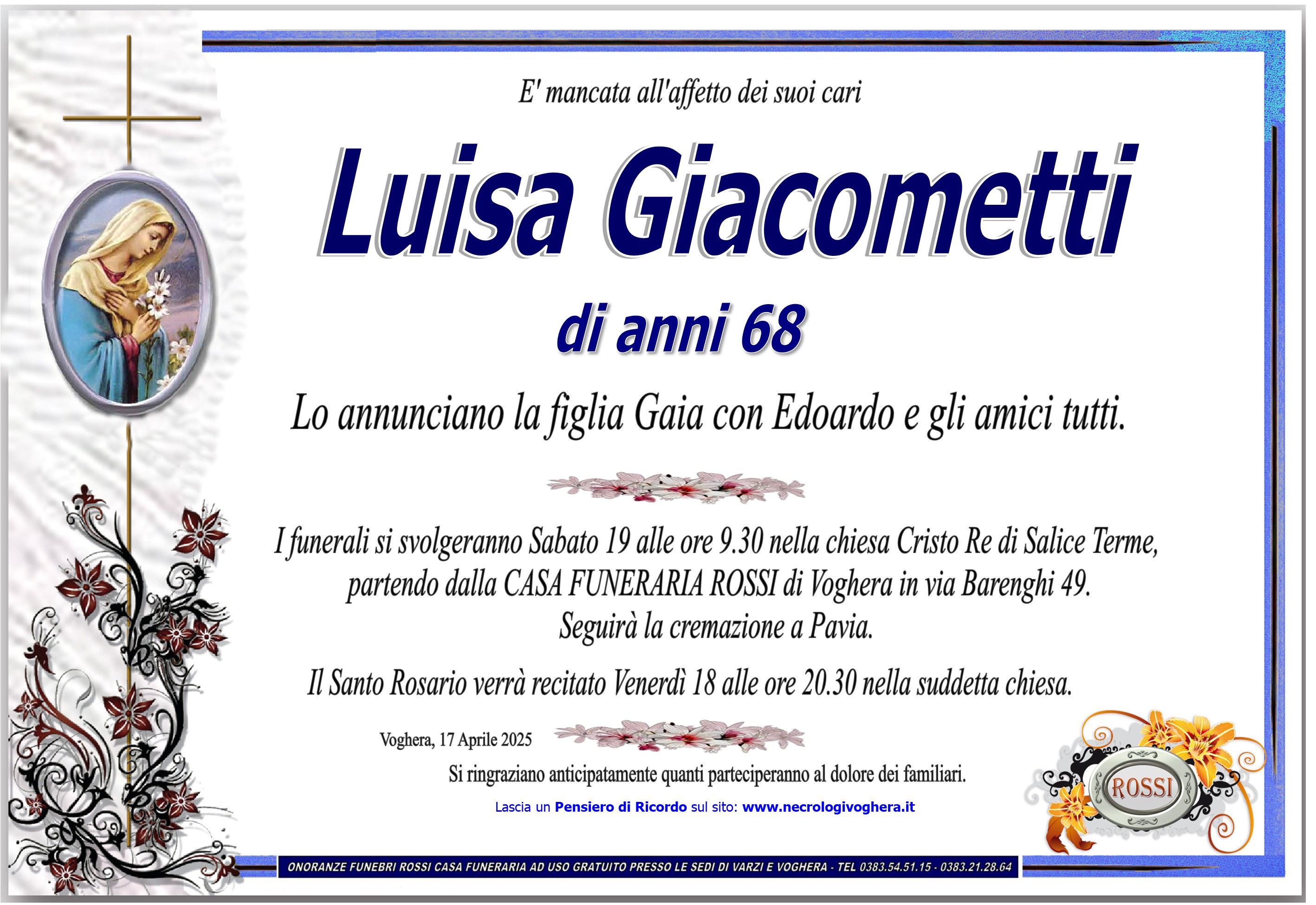 Con immenso dolore mi unisco ai familiari della Sig.ra Luisa, e porgo le più sentite condoglianze 17 Aprile 2025 Laura Canestrari