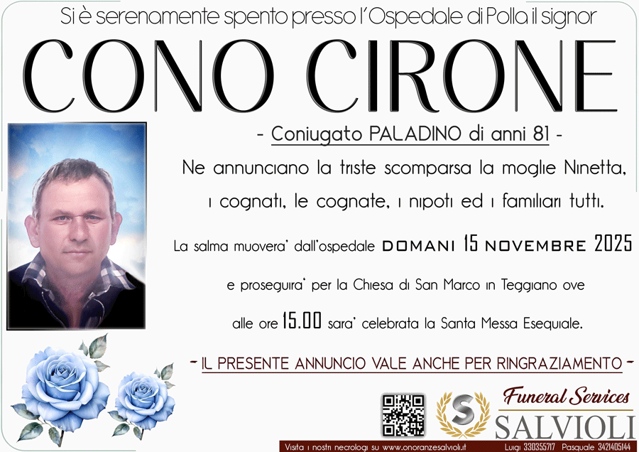 Siamo dispiaciuti per la scomparsa di Cono. Ci stringiamo al dolore della moglie e della famiglia tutta. Teresa Carrano, Costabile Funicello e famiglia