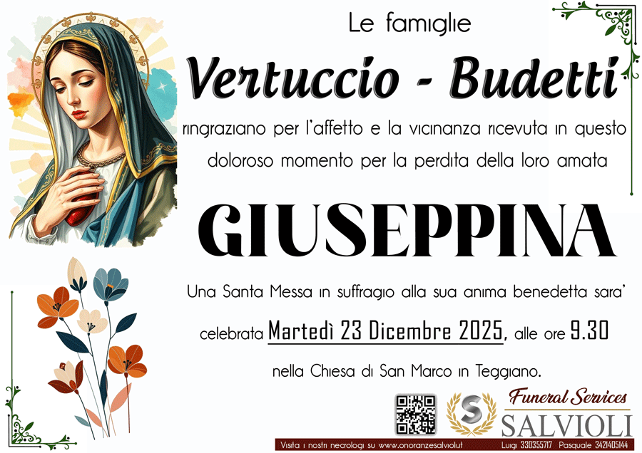 Essendo fuori Teggiano, non abbiamo potuto essere presenti alle esequie della cara Giuseppina. Giungano a tutti voi di famiglia le nostre più sincere e sentite condoglianze. Salvatore Gallo e Vincenzina Fasano