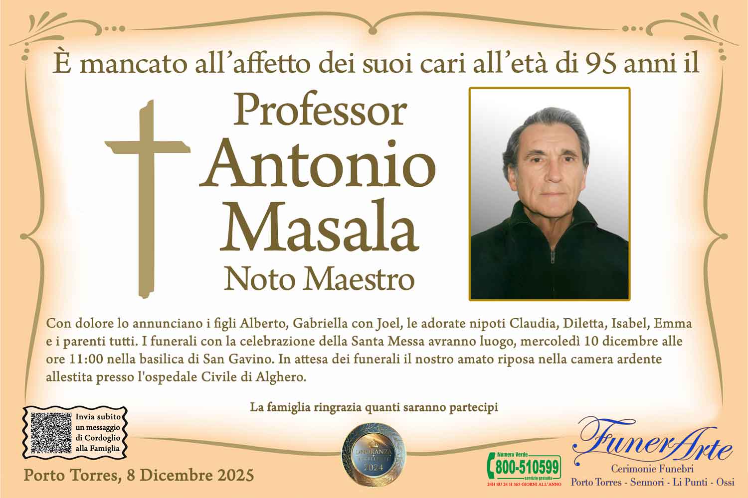 Con dolore lo annunciano i figli Alberto, Gabriella con Joel, le adorate nipoti Claudia, Diletta, Isabel, Emma e i parenti tutti. I funerali con la celebrazione della Santa Messa avranno luogo, mercoledì 10 dicembre alle ore 11:00 nella basilica di San Gavino. In attesa dei funerali il nostro amato riposa nella camera ardente allestita presso l'ospedale Civile di Alghero.