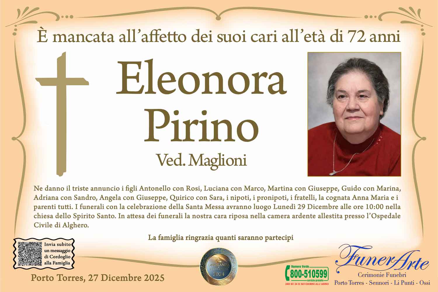 Ne danno il triste annuncio i figli Antonello con Rosi, Luciana con Marco, Martina con Giuseppe, Guido con Marina, Adriana con Sandro, Angela con Giuseppe, Quirico con Sara, i nipoti, i pronipoti, i fratelli, la cognata Anna Maria e i parenti tutti. I funerali con la celebrazione della Santa Messa avranno luogo Lunedì 29 Dicembre alle ore 10:00 nella chiesa dello Spirito Santo. In attesa dei funerali la nostra cara riposa nella camera ardente allestita presso l’Ospedale Civile di Alghero.