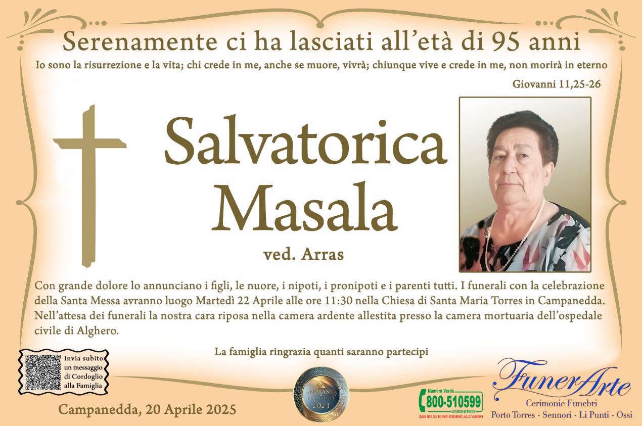 Con grande dolore lo annunciano i figli, le nuore, i nipoti, i pronipoti e i parenti tutti. I funerali con la celebrazione della Santa Messa avranno luogo Martedì 22 Aprile alle ore 11:30 nella Chiesa di Santa Maria Torres in Campanedda. Nell’attesa dei funerali la nostra cara riposa nella camera ardente allestita presso la camera mortuaria dell’ospedale civile di Alghero.