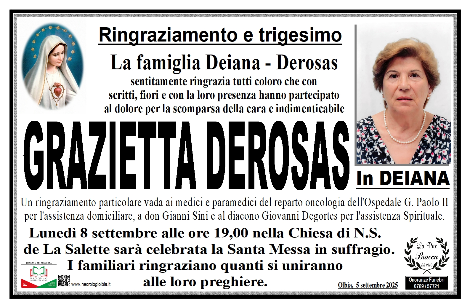 Ne danno il triste annuncio il marito Mario, la figlia Rossana con Tonio, gli adorati Lorenzo e Anna Maria, i nipoti, i cognati, le cognate e i parenti tutti.