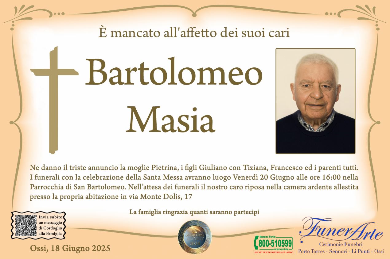 Ne danno il triste annuncio la moglie Pietrina, i figli Giuliano con Tiziana, Francesco ed i parenti tutti. I funerali con la celebrazione della Santa Messa avranno luogo Venerdì 20 Giugno alle ore 16:00 nella Parrocchia di San Bartolomeo. Nell’attesa dei funerali il nostro caro riposa nella camera ardente allestita presso la propria abitazione in via Monte Dolis, 17