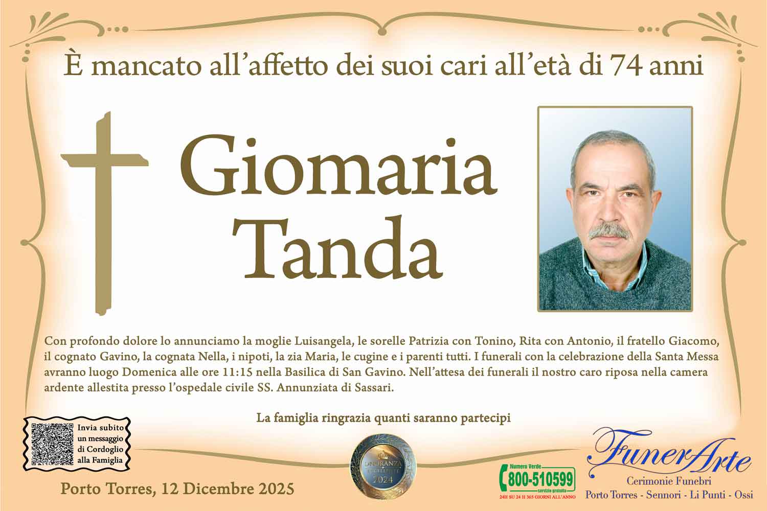 Con profondo dolore lo annunciamo la moglie Luisangela, le sorelle Patrizia con Tonino, Rita con Antonio, il fratello Giacomo, il cognato Gavino, la cognata Nella, i nipoti, la zia Maria, le cugine e i parenti tutti. I funerali con la celebrazione della Santa Messa avranno luogo Domenica 14 Dicembre alle ore 11:15 nella Basilica di San Gavino. Nell’attesa dei funerali il nostro caro riposa nella camera ardente allestita presso l’ospedale civile SS. Annunziata di Sassari.