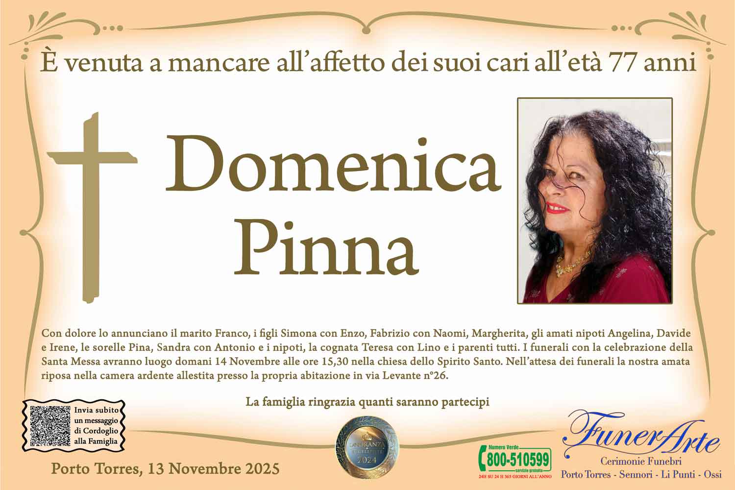 Con dolore lo annunciano il marito Franco, i figli Simona con Enzo, Fabrizio con Naomi, Margherita, gli amati nipoti Angelina, Davide e Irene, le sorelle Pina, Sandra con Antonio e i nipoti, la cognata Teresa con Lino e i parenti tutti. I funerali con la celebrazione della Santa Messa avranno luogo domani 14 Novembre alle ore 15,30 nella chiesa dello Spirito Santo. Nell’attesa dei funerali la nostra amata riposa nella camera ardente allestita presso la propria abitazione in via Levante n°26.