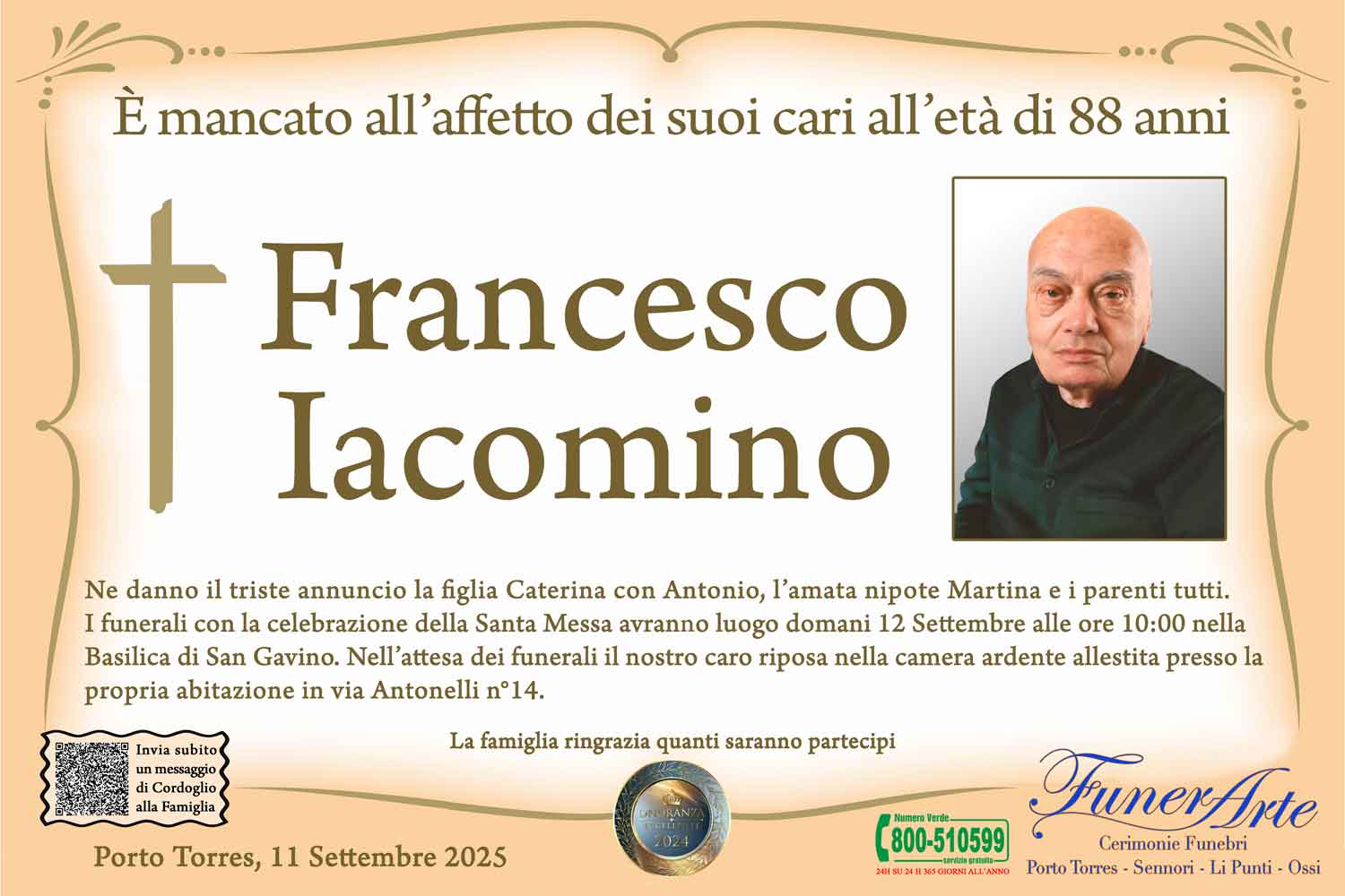 Ne danno il triste annuncio la figlia Caterina con Antonio, l’amata nipote Martina e i parenti tutti. I funerali con la celebrazione della Santa Messa avranno luogo domani 12 Settembre alle ore 10:00 nella Basilica di San Gavino. Nell’attesa dei funerali il nostro caro riposa nella camera ardente allestita presso la propria abitazione in via Antonelli n°14.
