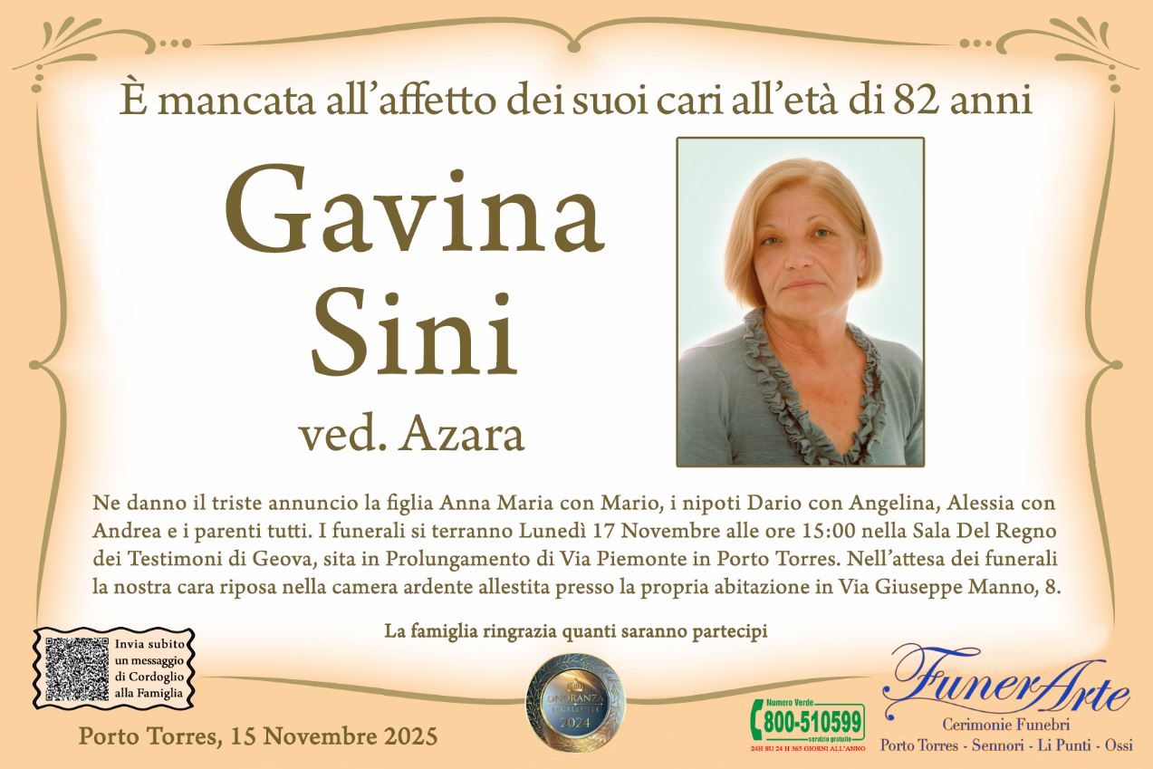 Ne danno il triste annuncio la figlia Anna Maria con Mario, i nipoti Dario con Angelina, Alessia con Andrea e i parenti tutti. I funerali si terranno Lunedì 17 Novembre alle ore 15:00 nella Sala Del Regno dei Testimoni di Geova, sita in Prolungamento di Via Piemonte in Porto Torres. Nell’attesa dei funerali la nostra cara riposa nella camera ardente allestita presso la propria abitazione in Via Giuseppe Manno, 8.
