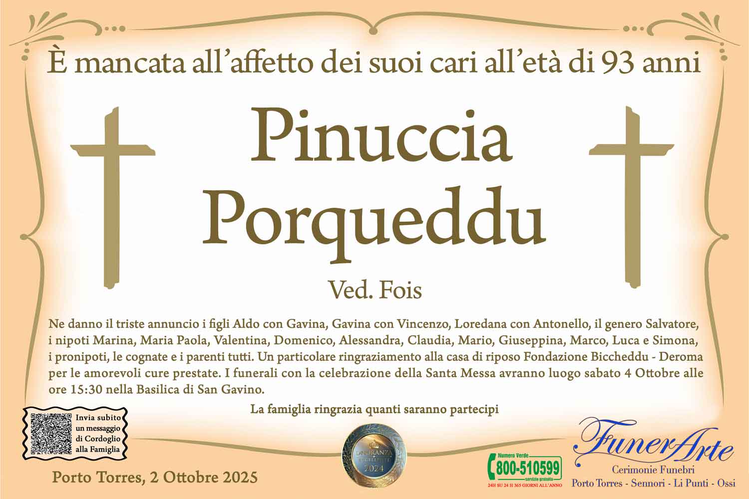 Ne danno il triste annuncio i figli Aldo con Gavina, Gavina con Vincenzo, Loredana con Antonello, il genero Salvatore, i nipoti Marina, Maria Paola, Valentina, Domenico, Alessandra, Claudia, Mario, Giuseppina, Marco, Luca e Simona, i pronipoti, le cognate e i parenti tutti. Un particolare ringraziamento alla casa di riposo Fondazione Biccheddu - Deroma per le amorevoli cure prestate. I funerali con la celebrazione della Santa Messa avranno luogo sabato 4 Ottobre alle ore 15:30 nella Basilica di San Gavino.